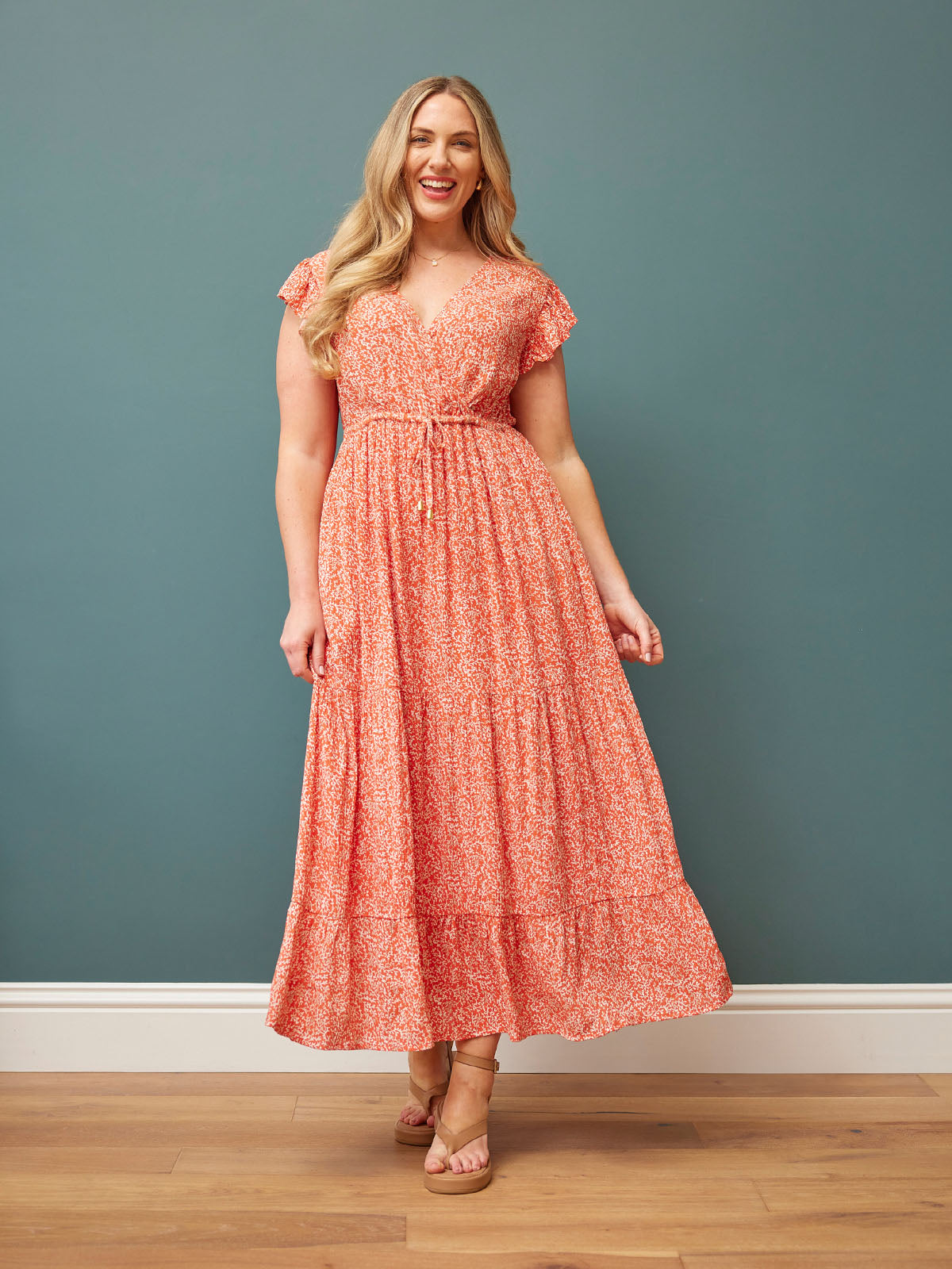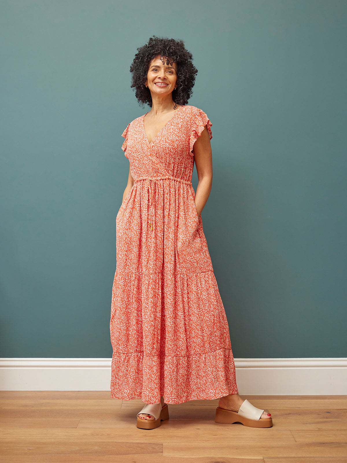 With its wrap front top, drawcord waist and top-of-arms covering frill sleeve, this dress is the ultimate in flattering summer styling.