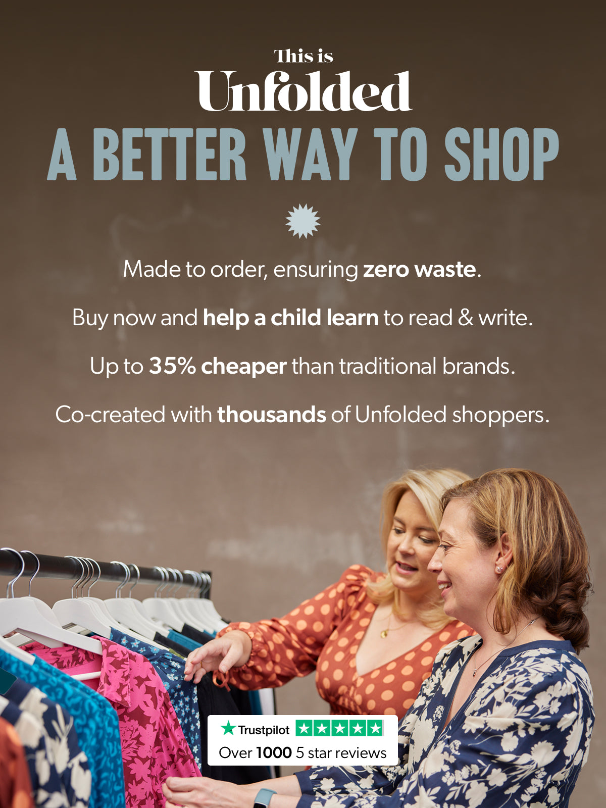 When Unfolded started in Edinburgh in 2021 it was with 100 customers helping us design the first collection, today we’ve got an amazing community of 50,000+ women across the UK who choose to shop without the waste and do good with the savings! Together they’ve support 7,500 kids in India to learn to read and write! Now that sounds like a better outcome than mountains of waste doesn’t it?