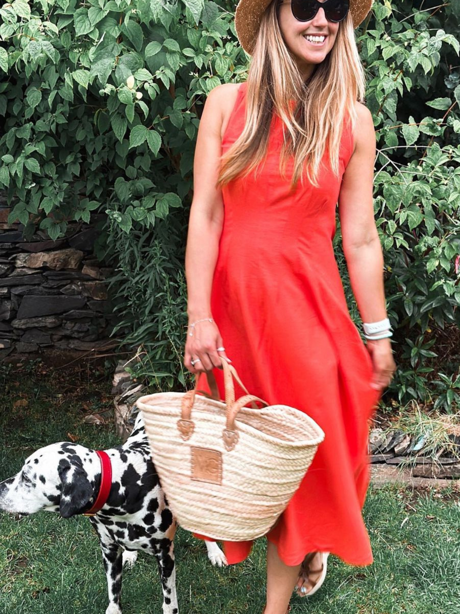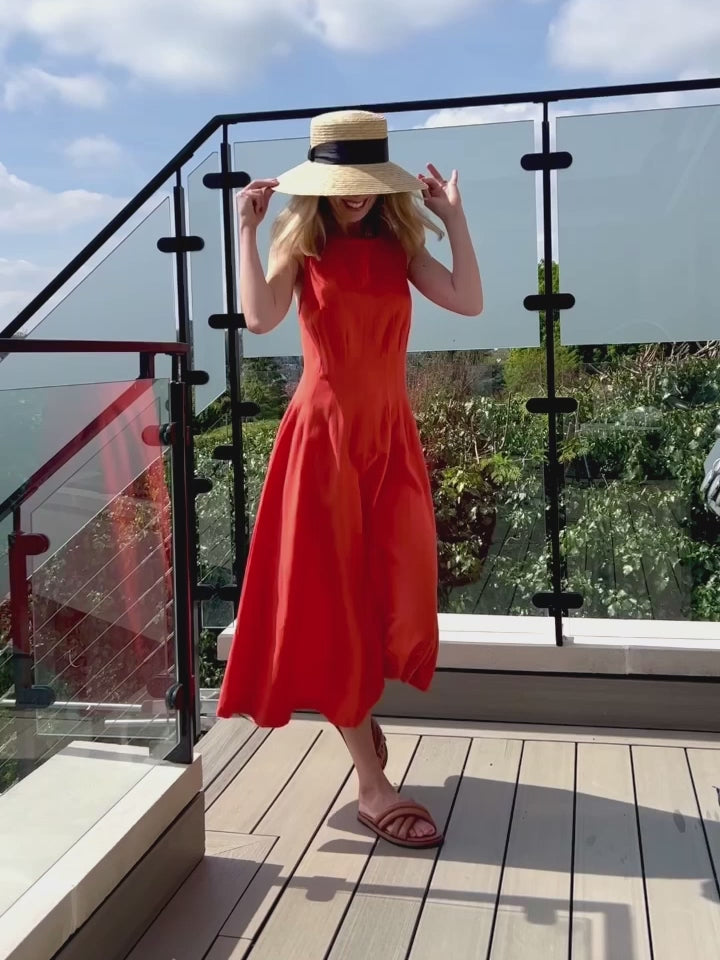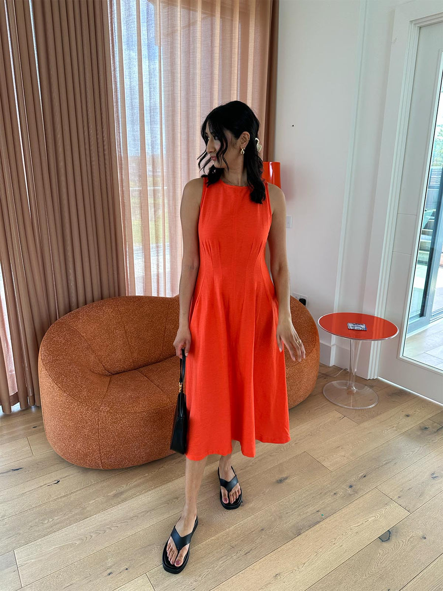 A stunning cross backed midi length linen blend dress - works well for work, play and everything in between - the Claire is our favourite cross-backed, midi-length wear-anywhere dress. With a high neck and fitted bodice, it is easy to style with your favourite accessories. Classy enough for work, and the cross-back adds a fun twist. In a bright flame colour this beautiful sustainable cotton-linen blend dress will add a pop of colour to your wardrobe. The Claire has a concealed back zip, and front bodice darts that add shaping.
