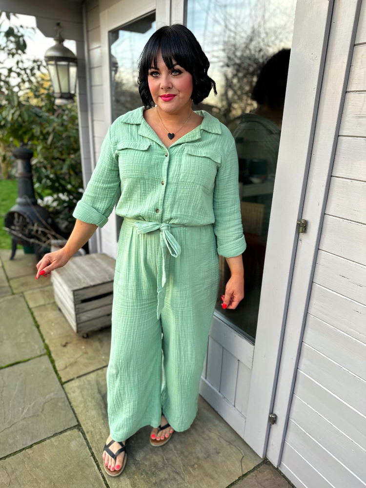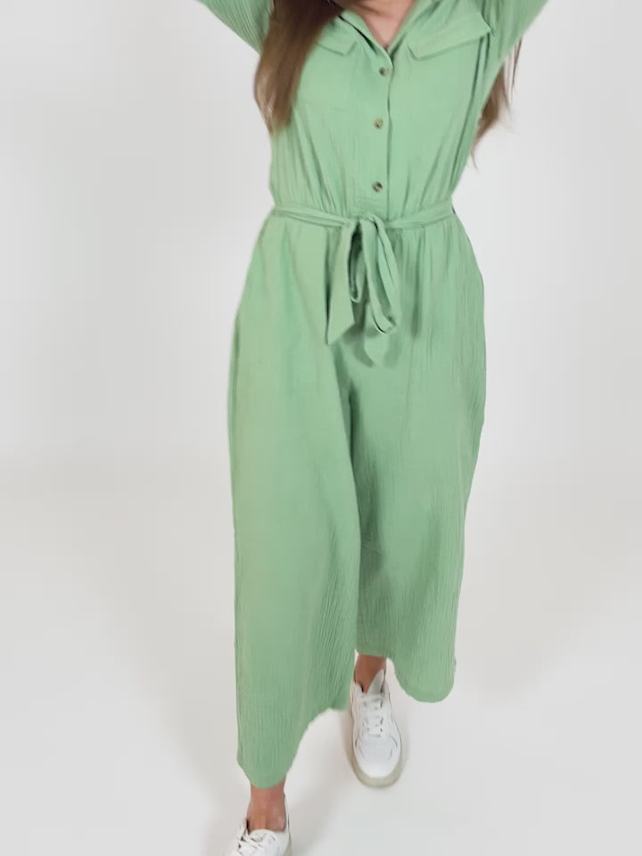 Made from 100% sustainably sourced cotton, this green utility jumpsuit will be a practical staple in your wardrobe for a long, long time.