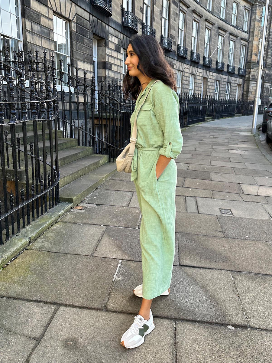 Made from 100% sustainably sourced cotton, this green utility jumpsuit will be a practical staple in your wardrobe for a long, long time.