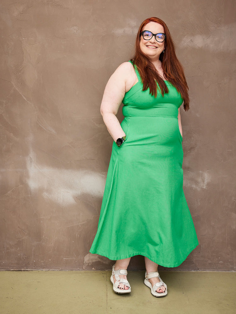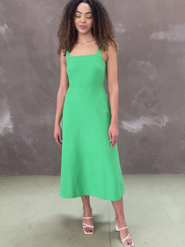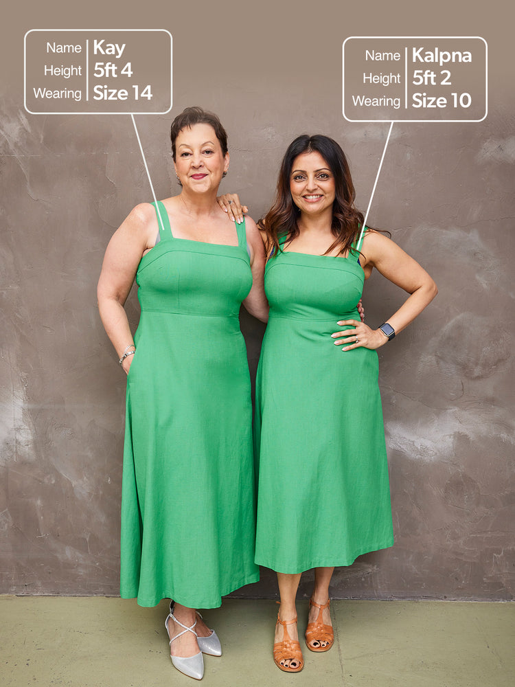 Do you love the idea of a sustainable strappy sundress but not the thought of going braless? Well, our Sara sundress is for you. Made in a stunning green linen mix fabric, Sara has a square neck, straps that are thick enough to hide your bra, a concealed back zip and a fashionable (and flattering!) A-line shape.
