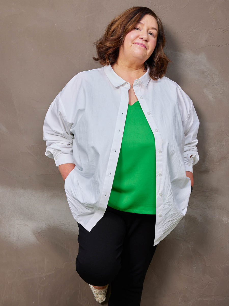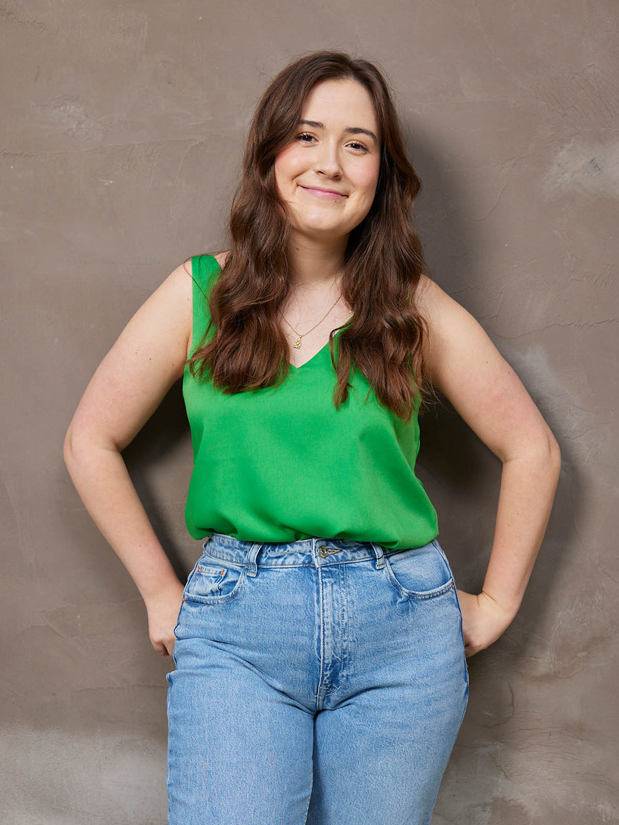 The Chelle was so popular in our last collection that the black version sold out in record time. A flattering camisole made from recycled materials and with a V-neck shape that will look flattering on everyone (yes, you particularly!). You can wear it with our Sophia wide-leg trousers in green as a full set, or mix and match it with any other pieces for a comfortable, ready-for-anything look.