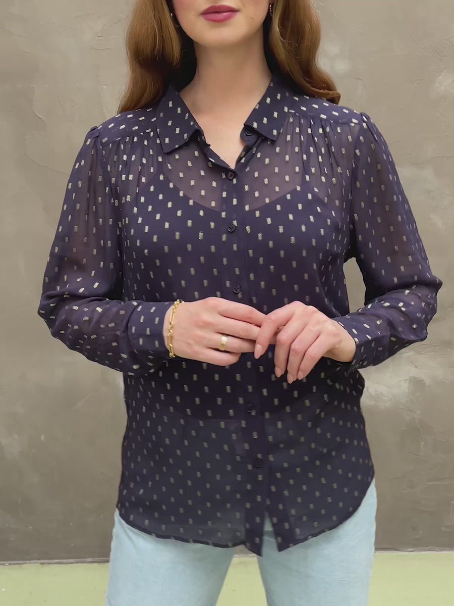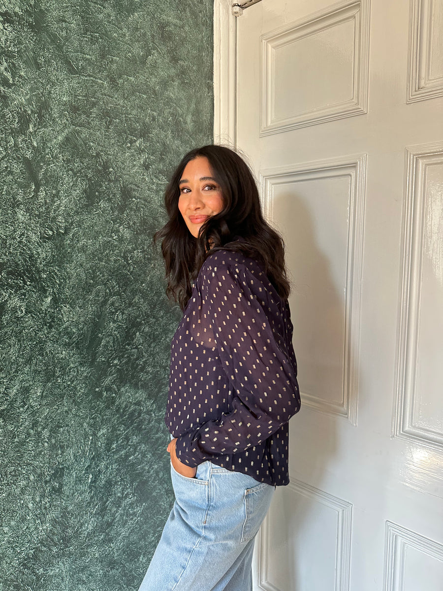 Collette - Long Sleeve Lurex Dobby Shirt - Navy and Gold