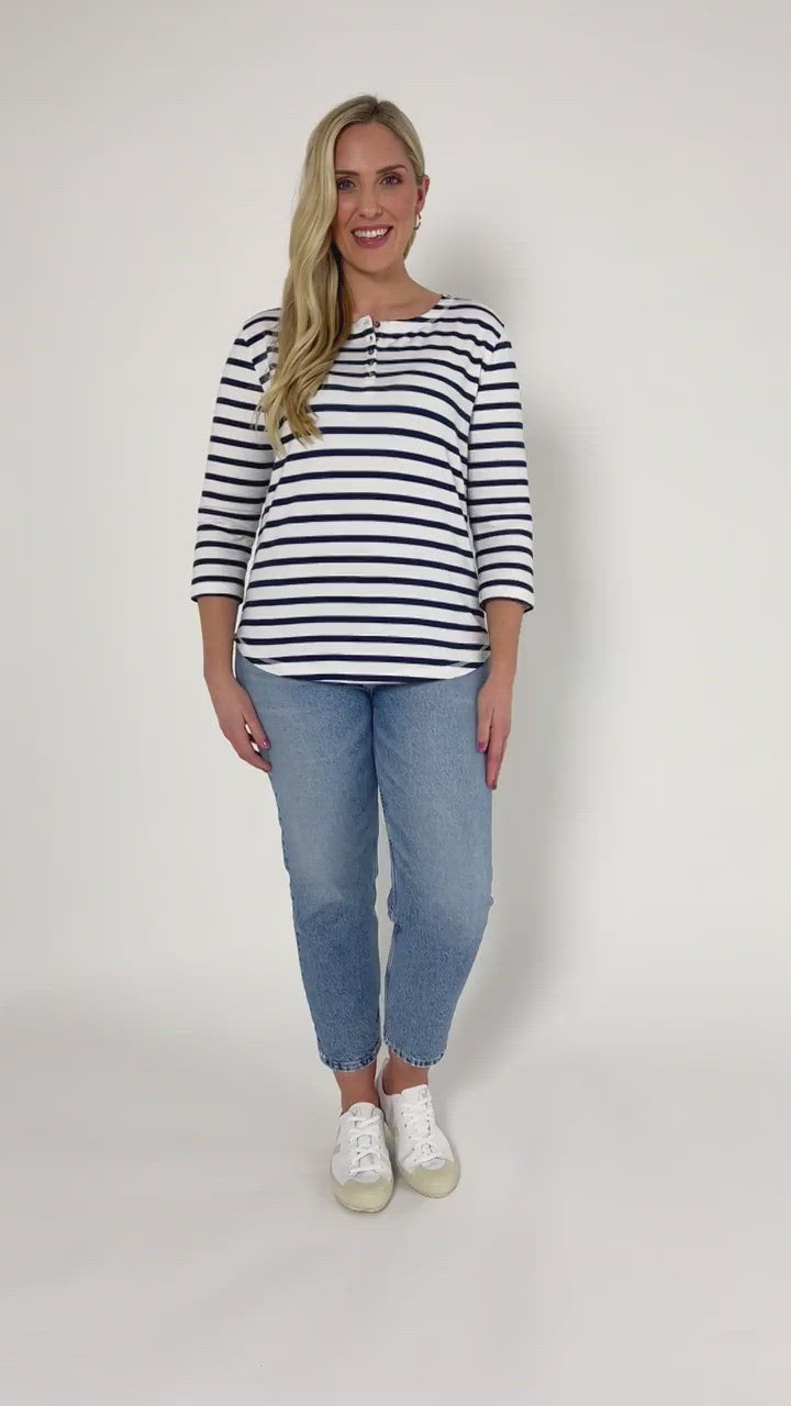 We cannot get enough of this classic Breton-style in navy and white. With a new take on a tried-and-tested favourite, the Elizabeth has handy neckline buttons so it can be worn in a few different ways. It has 3/4 length sleeves and the super soft material with just a little bit of stretch means this is a comfortable way to have instant, classic style.
