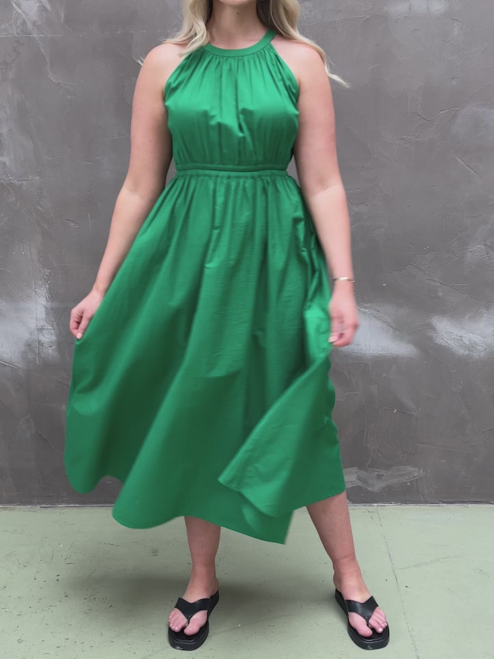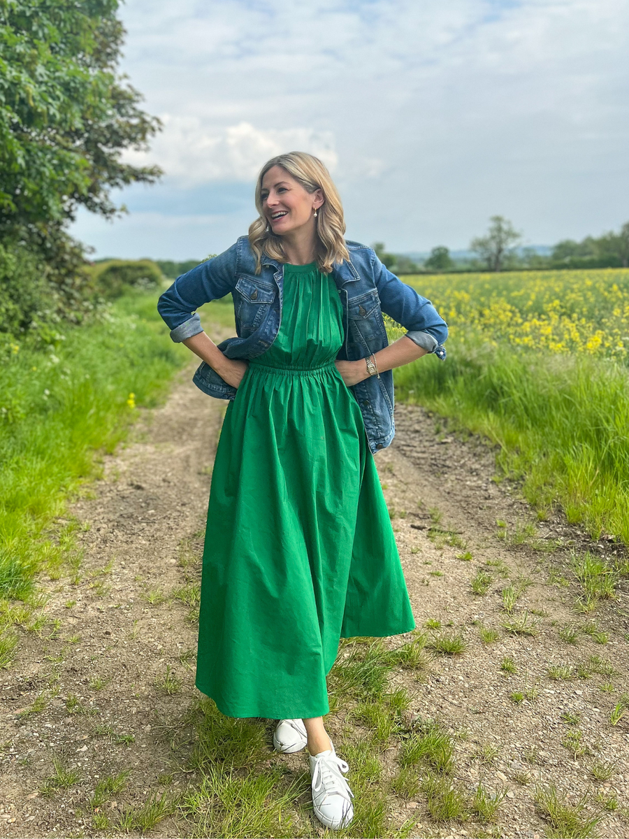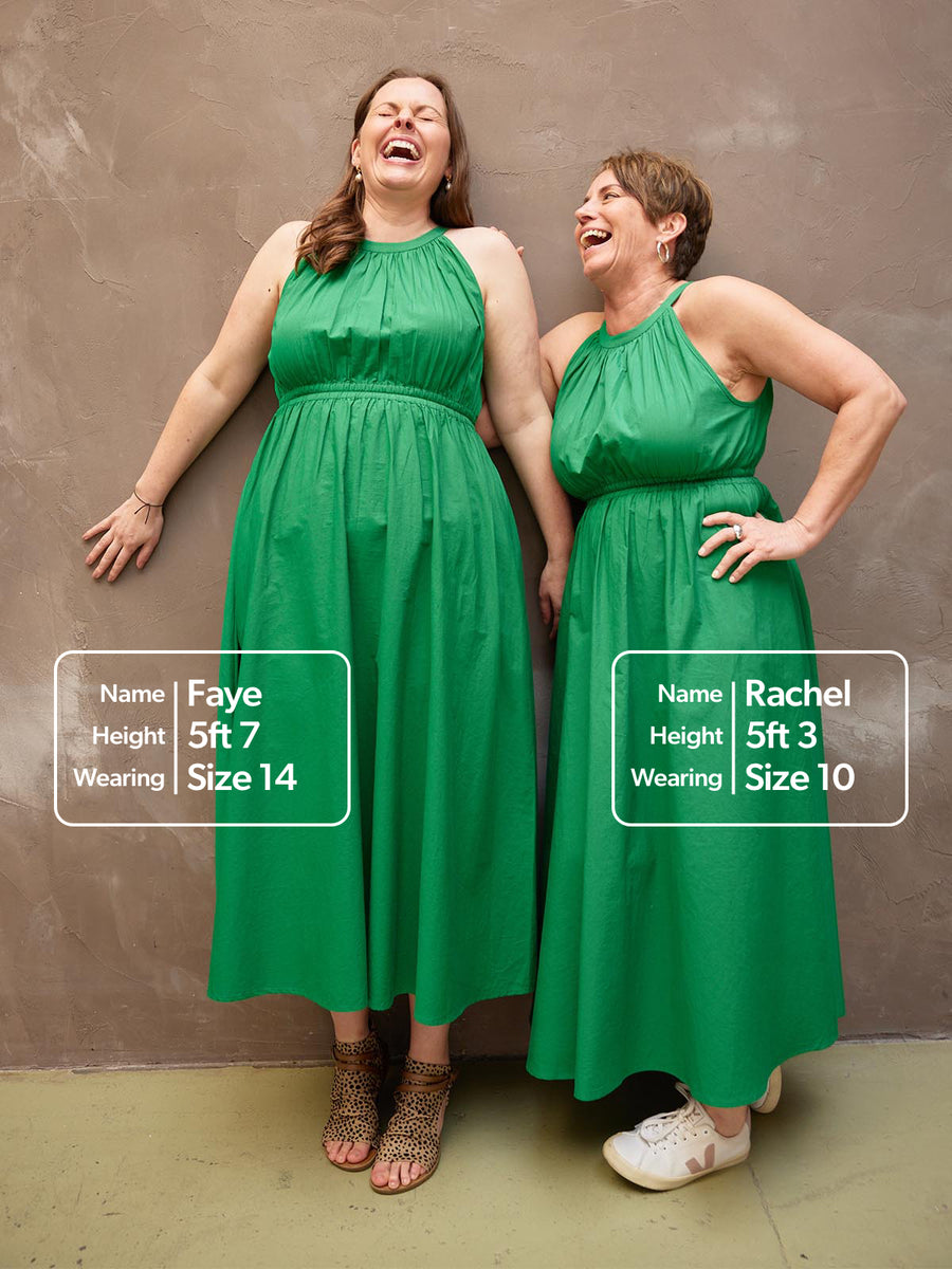 The colour of the Faye dress was the top selected colour for this collection by the Unfolded community - by far! It’s a great rich green shade that makes Faye perfect for more dressed up events (your wedding guest dress is sorted) and also for a relaxed day in a beer garden with white trainers. Faye has a halter neckline with covered back, gathered detail at the front, an elasticated waist for comfort and is made from a beautiful cotton poplin fabric. Faye is best worn with a strapless bra. Every purchase supports a child to learn to read and write for 2 months.