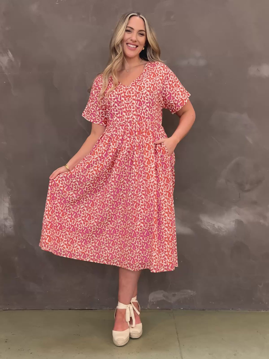 With her relaxed fit, loosely gathered waist and flattering v-neck the Fern dress really is the most comfortable wear all-day-every-day dress for summery months.