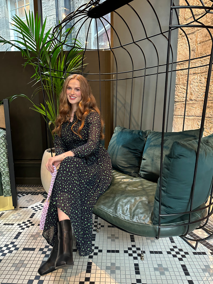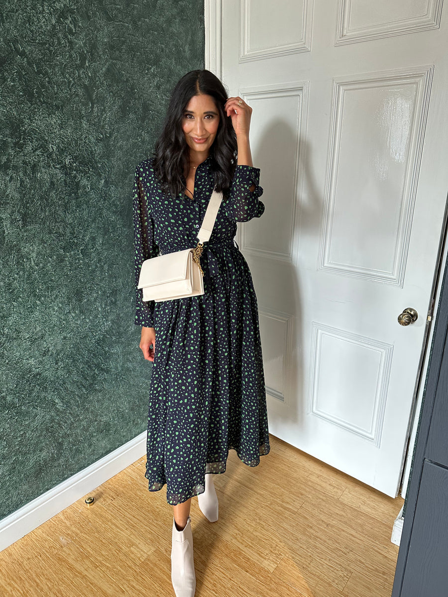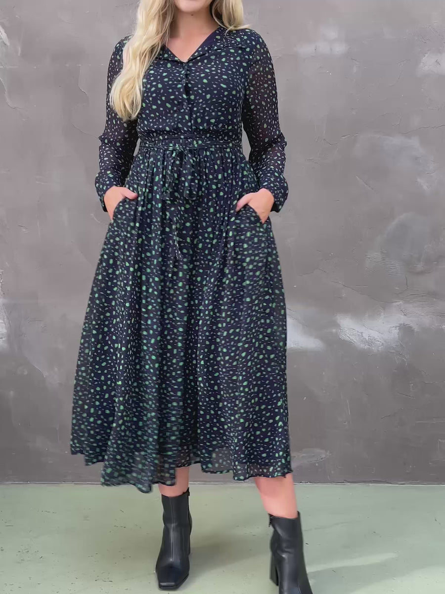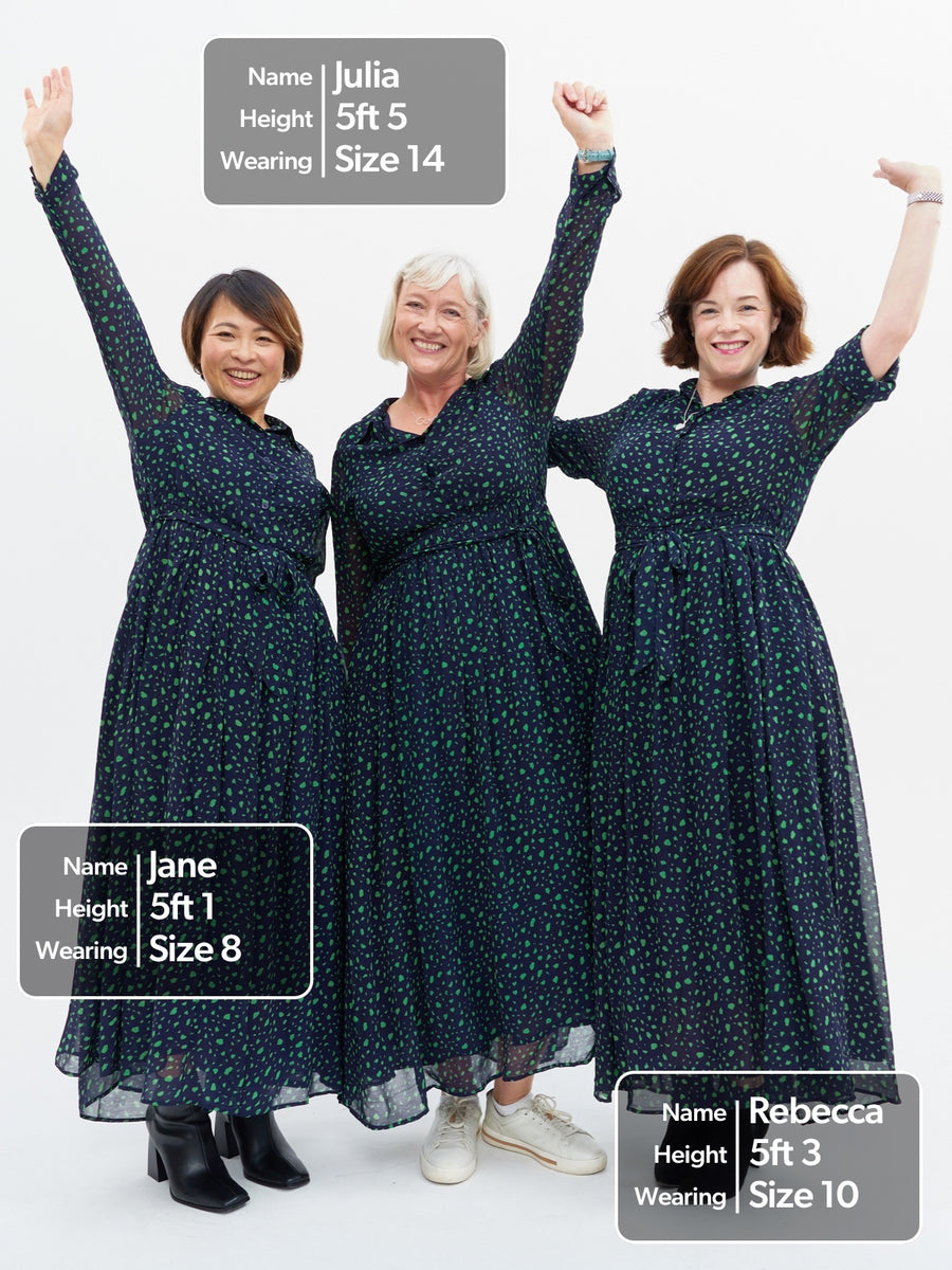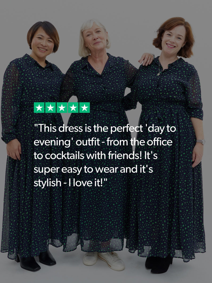 It would be hard to find a more perfect sustainable shirt dress that really can be used in any situation. The Julia is our longer length, printed midi shirt dress in a navy and green smudge print, with a full skirt, lined body and sheer sleeves. It's buttoned to the waist (which is elasticated), and has a stylish shirt collar, a removable belt and two delightful pockets.