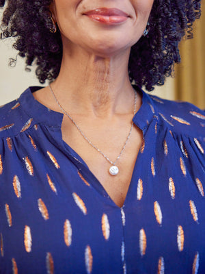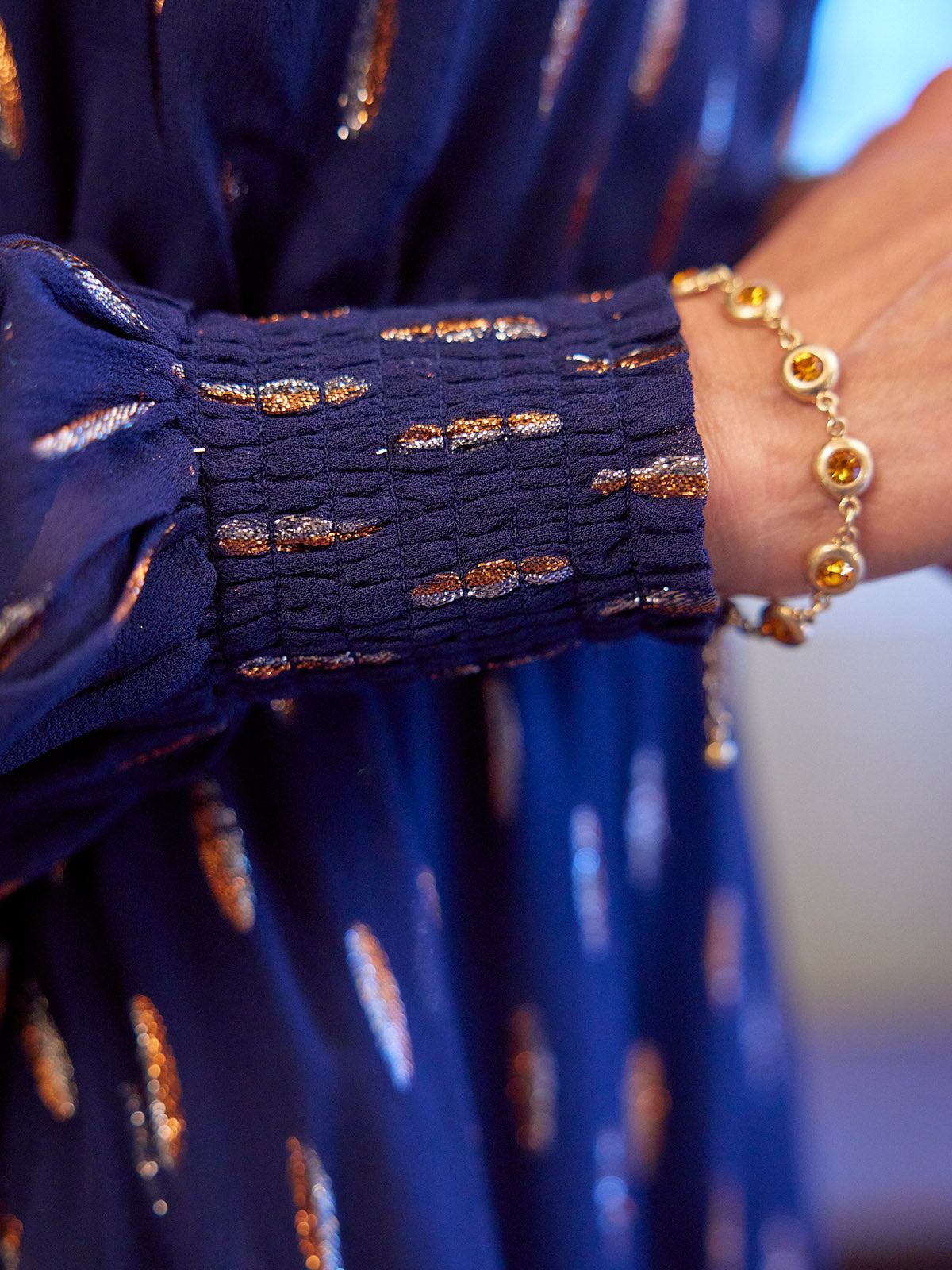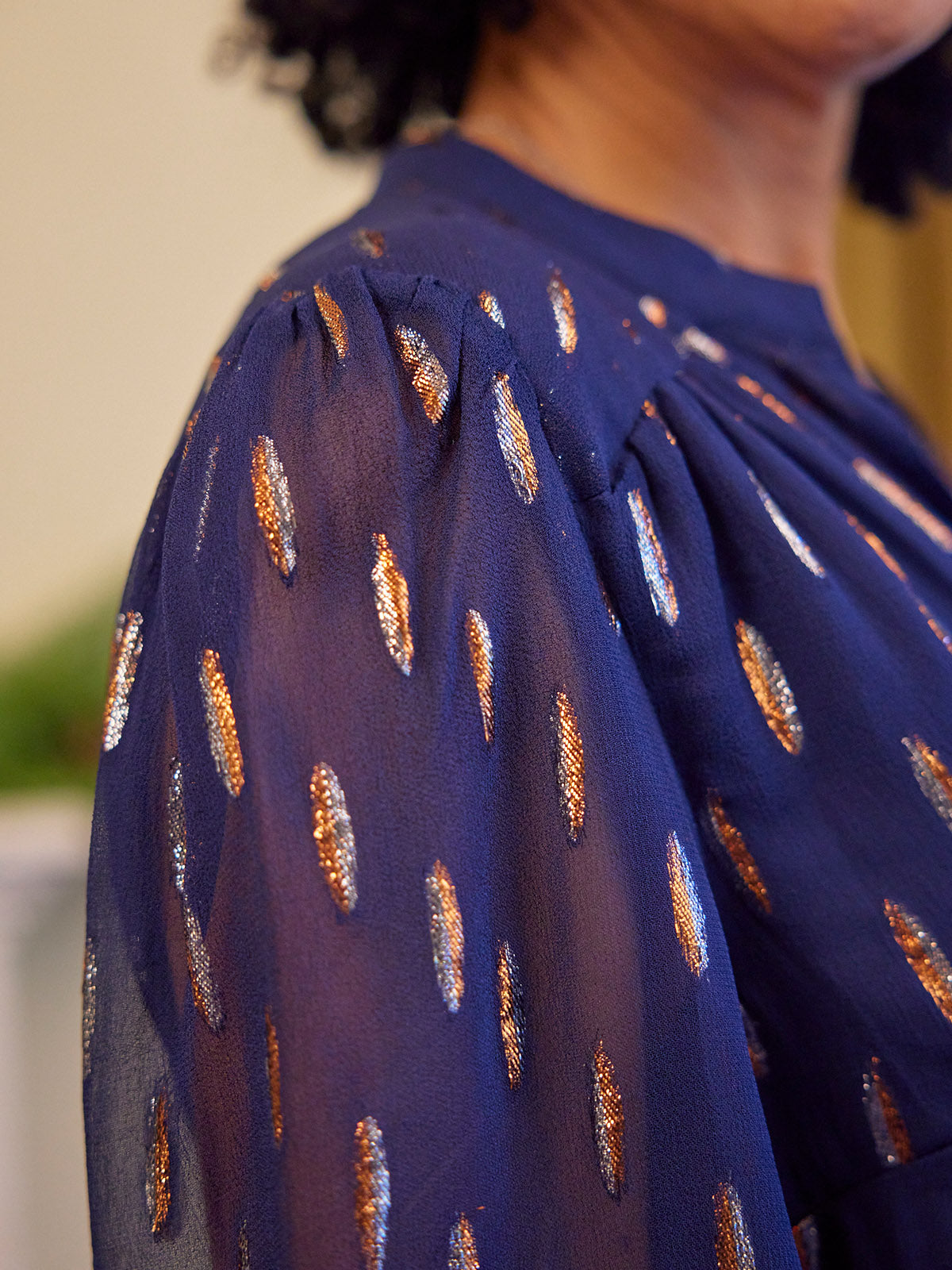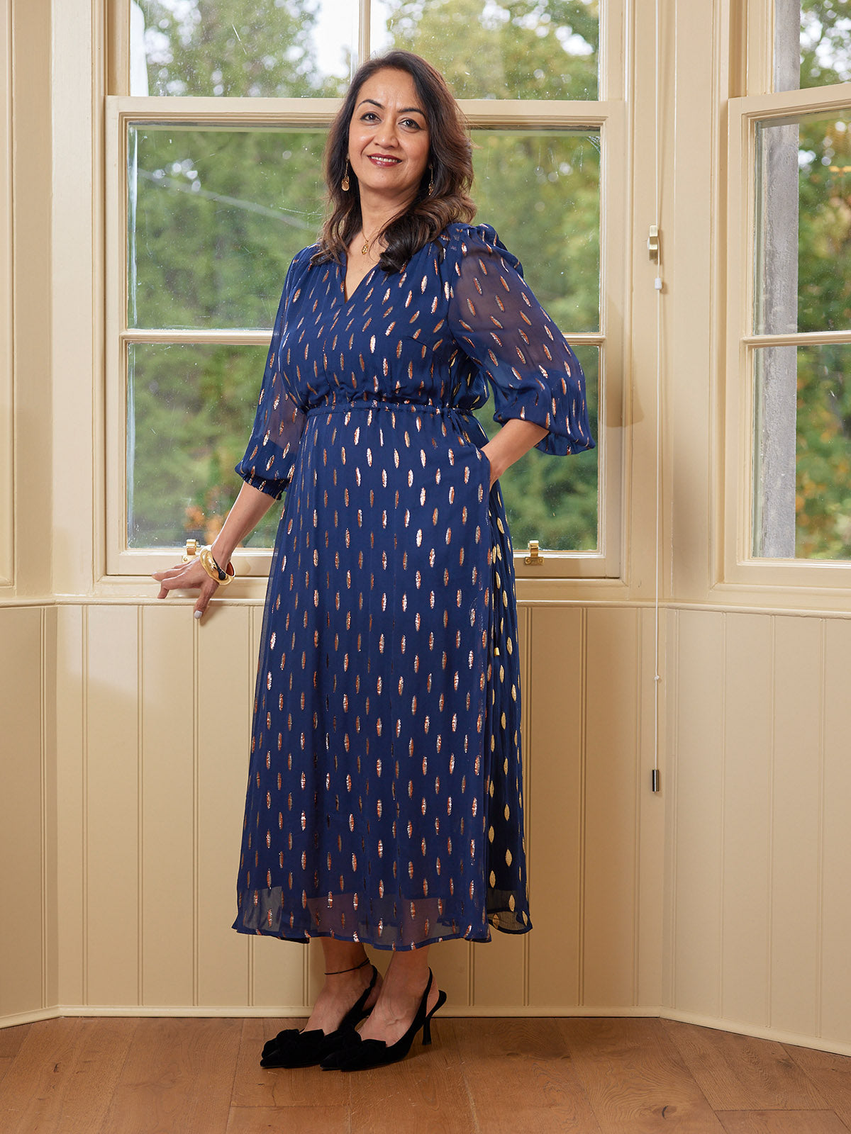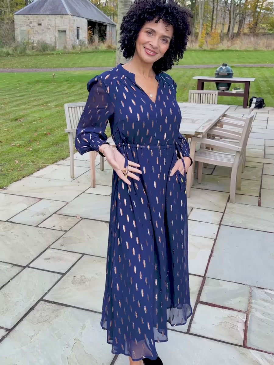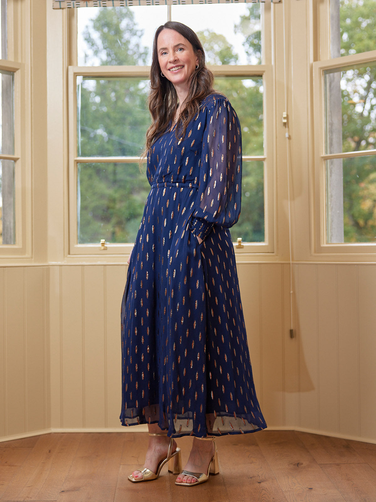 Back by popular demand! Our Libby lurex party dress is one of our absolute customer favourites - and this time we’ve made her in a beautiful navy fabric with a just launched silver and bronze lurex print. The Libby is the perfect winter party dress; made in a delicate woven viscose georgette fabric with silver and bronze lurex to add interest and glamour, this midi dress hits that perfect note of daytime appropriate partywear that can be dressed up and down for day or night celebrations.