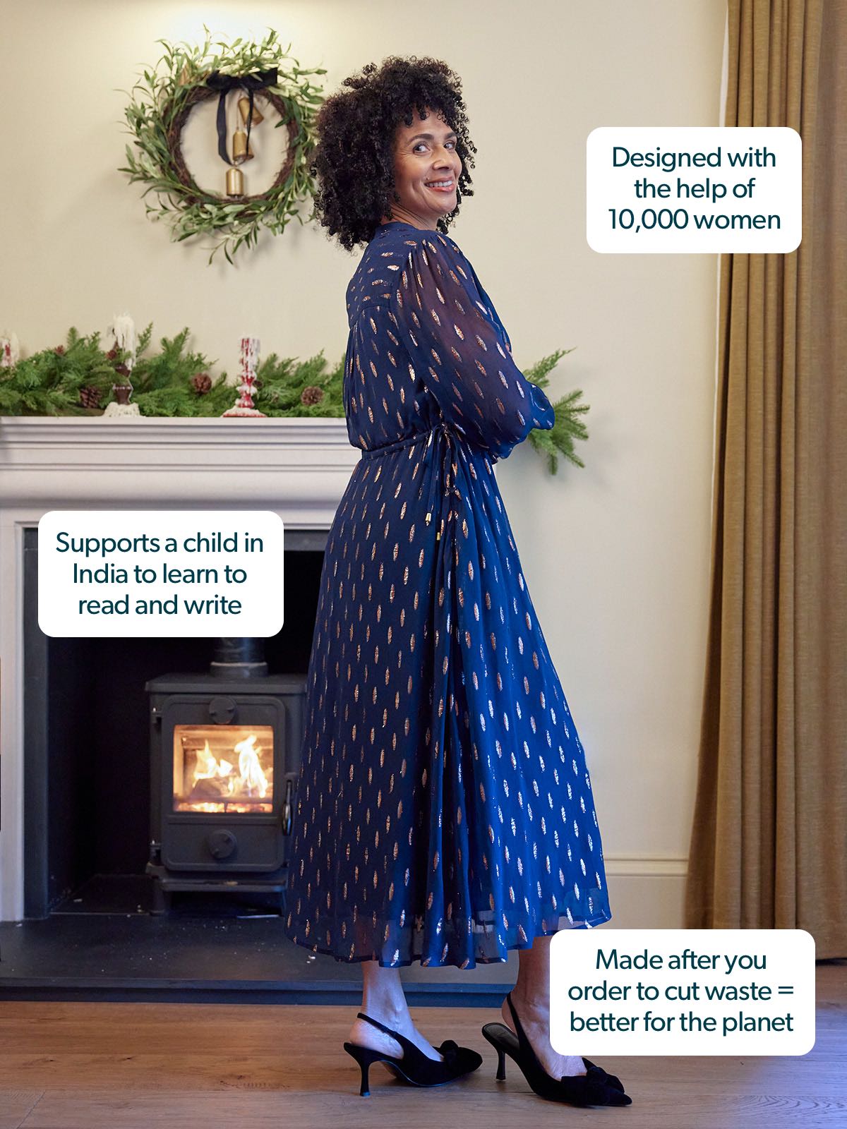 A beautiful midaxi length - and with those all important pockets, this dress is one of those that will make you feel good no matter what the special occasion. And so you should, as buying it will also fund a child in education for two months!