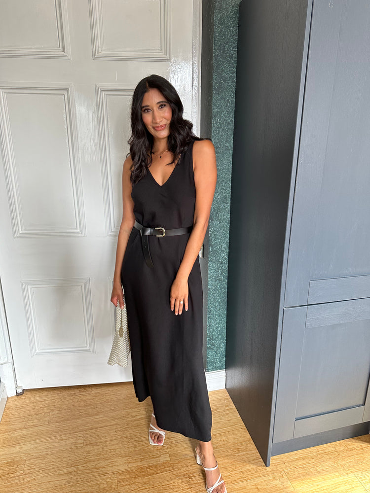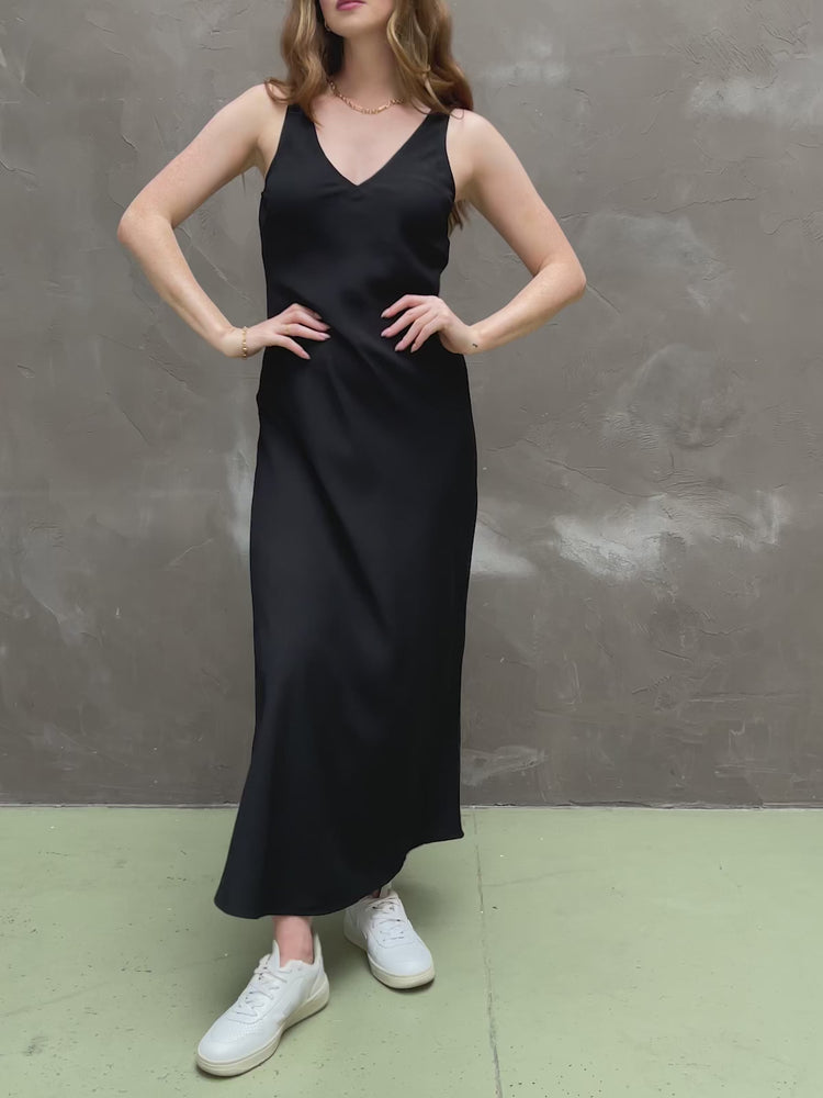 A little black dress is a wardrobe staple, and this flattering bias-cut midaxi dress in a silky smooth recycled material is bound to be your easy-to-wear go-to LBD this party season. The Rebecca is a sustainably made black dress with a V-neck shape both front and back. The bias cut gives it a flattering shape, and this dress is gorgeous on and super easy to style - you can wear it on its own or as a layering piece. Silky smooth and sleeveless with straps that are thick enough to wear with a bra, the Rebecca is a sustainable black dress that takes you effortlessly from day to night.