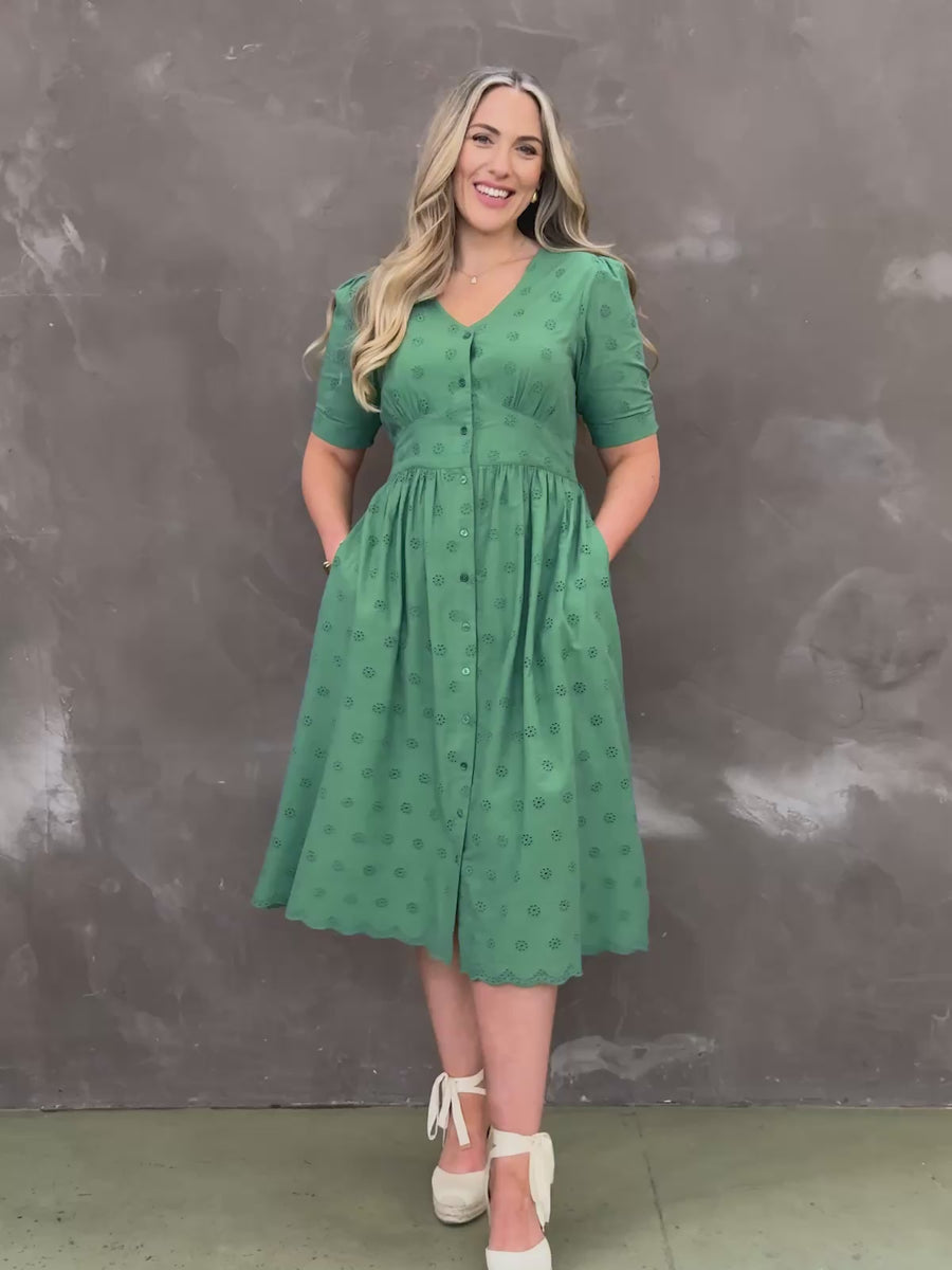 Meet our newest Rodica  - our bestselling shape now comes in a beautiful green broderie anglais fabric - creating an understated yet beautifully detailed, super comfortable dress.