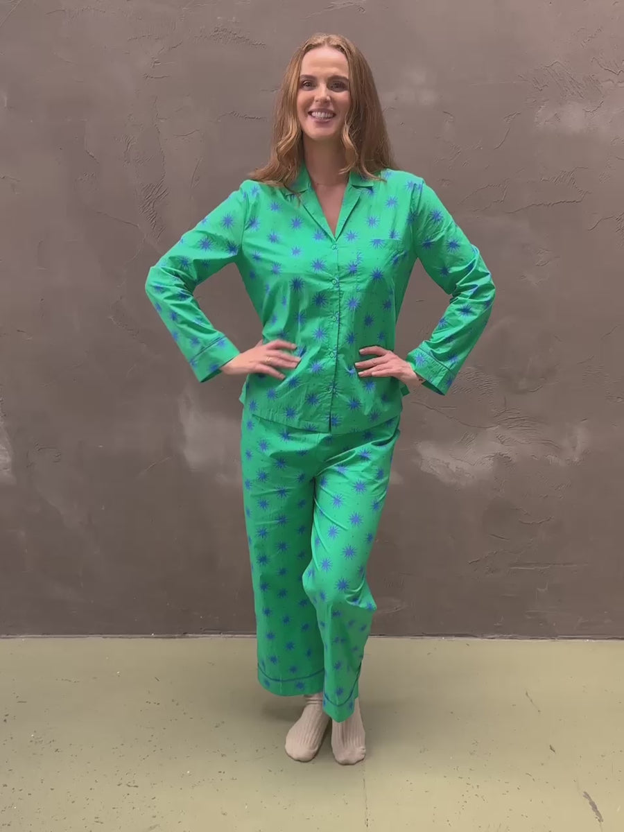 Our button-down pyjamas are super comfortable and super stylish - way too pretty just to wear to bed! Once you see past the fabulous eye catching prints, you’ll also notice all those little details that makes this sustainable PJ set extra luxurious: The piping on the cuffs and trouser edges, the deep pockets in the pyjama bottoms and the pocket detail on the shirt all add up to make these super comfortable pyjamas a cut above the rest.