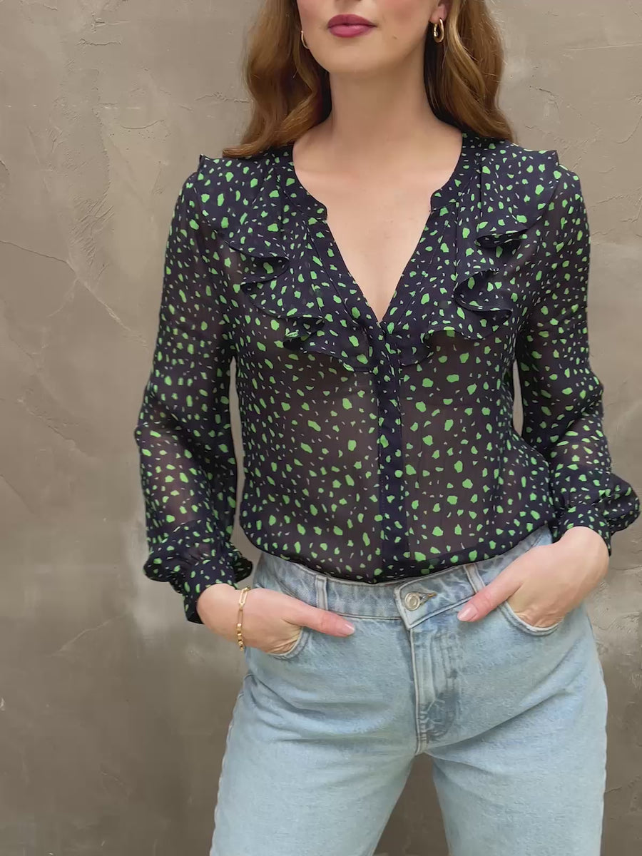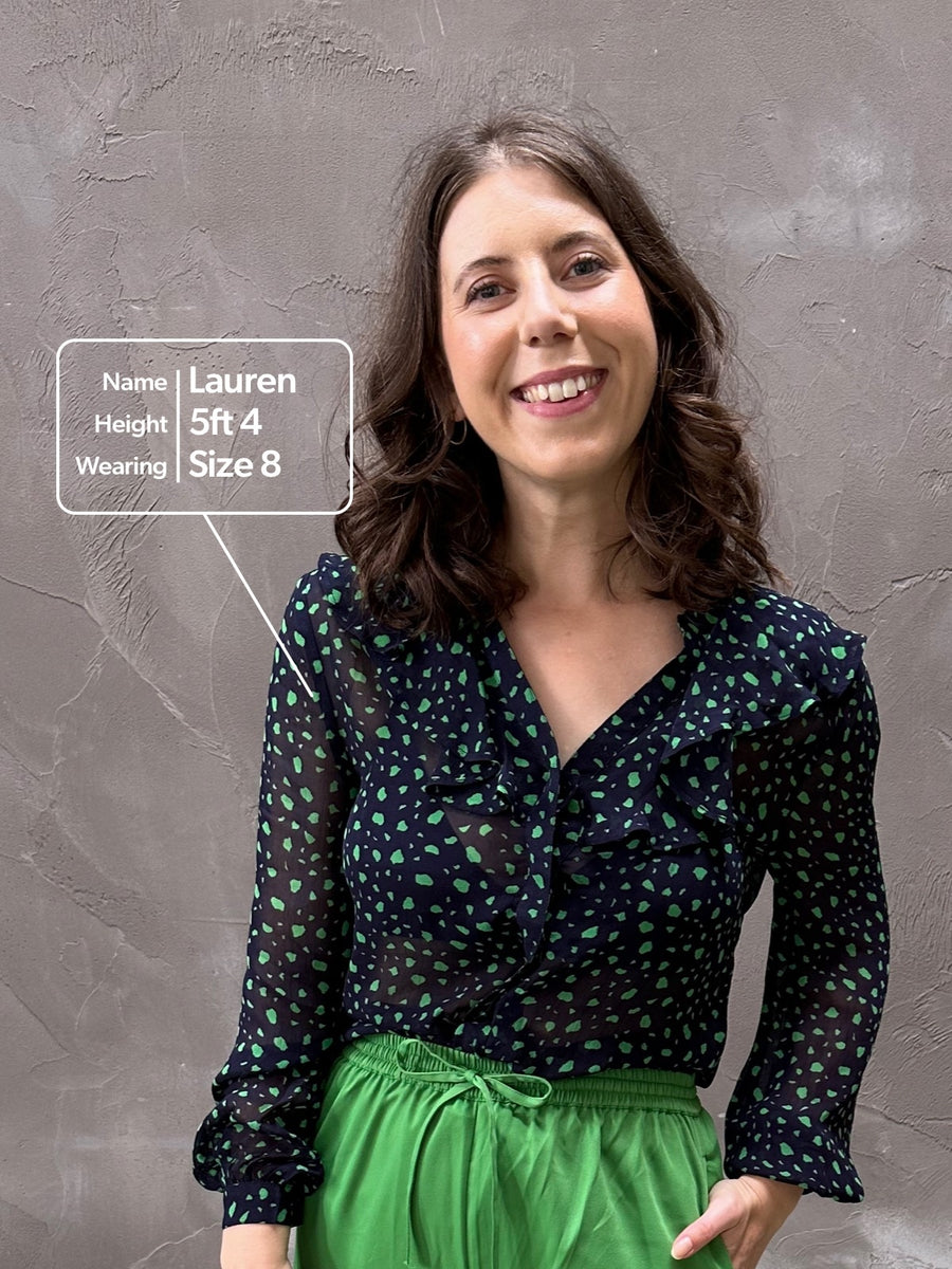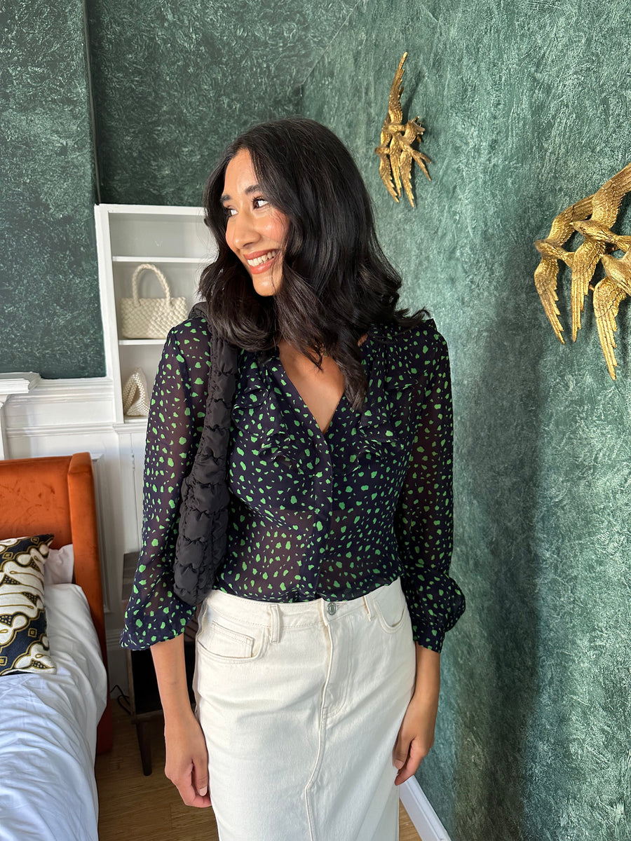 A sheer, mock collar blouse with an abstract green smudge print on a navy base - the Tessa is the perfect work-to-drinks blouse! Made from a sustainable sheer fabric and with beautiful detailing, including a lovely frill detail on the collar, the Tessa is designed to give that confidence that you look fantastic - no matter the occasion or how much notice you’ve had to get ready!