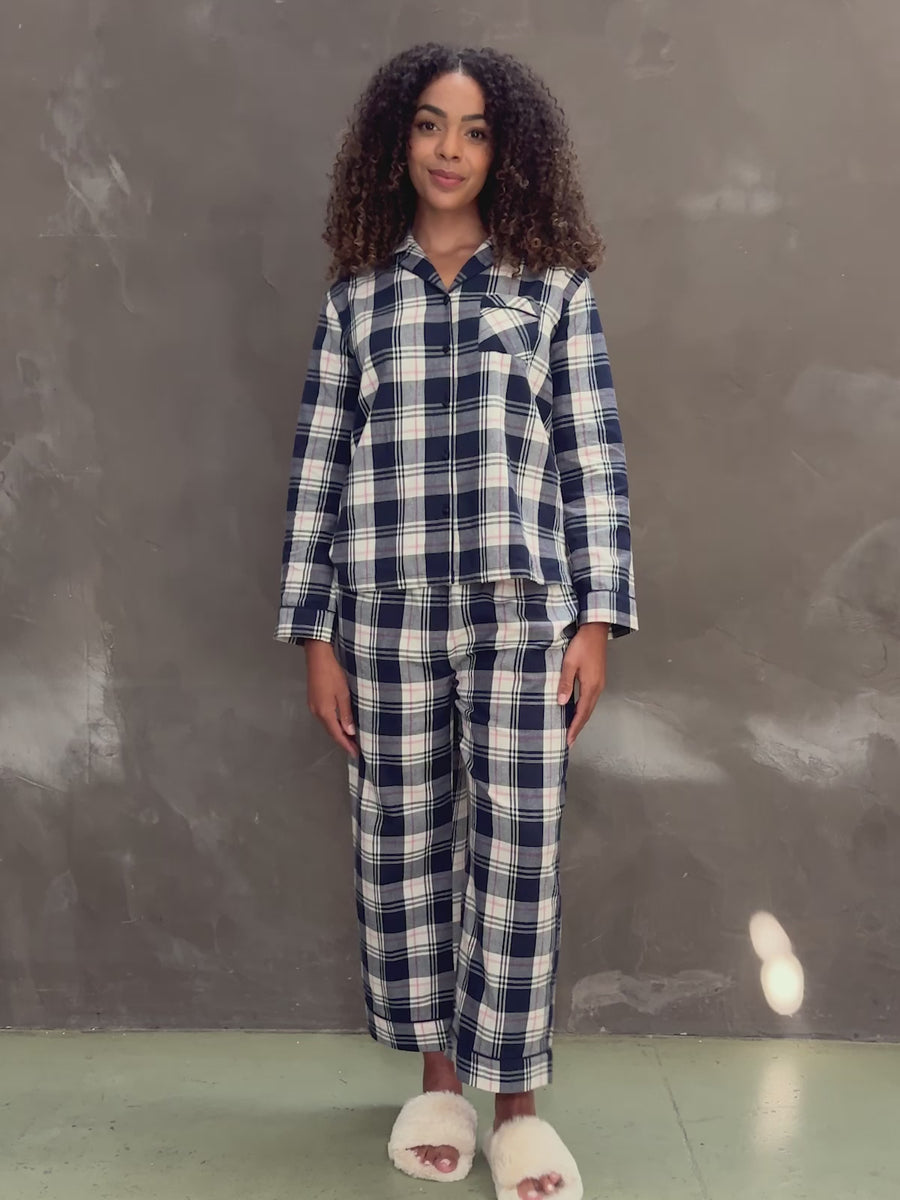 Our brand new Alice flannel check pyjamas are the perfect blend between cosy and comfy. These sustainable pyjamas are made in a gorgeous soft cotton flannel check material that is just the perfect thickness; soft and warm, and not at all rigid.