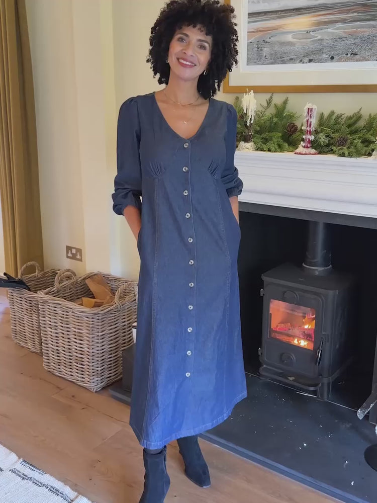 Anne is the perfect ‘wear all day every day’ dress - combining the versatility of soft chambray denim and a stylish and comfortable midi dress style. This mid-length button-down dress is a brand new shape for us, chosen with the help of 10,000 of our fabulous customers for its flattering, yet relaxed fit. Unlike some denims which can be stiff, this chambray denim fabric is gorgeously soft and comfortable, while the long blouson sleeves and midi length skirt ensure this is super cosy - your new go-to denim dress for the colder months.