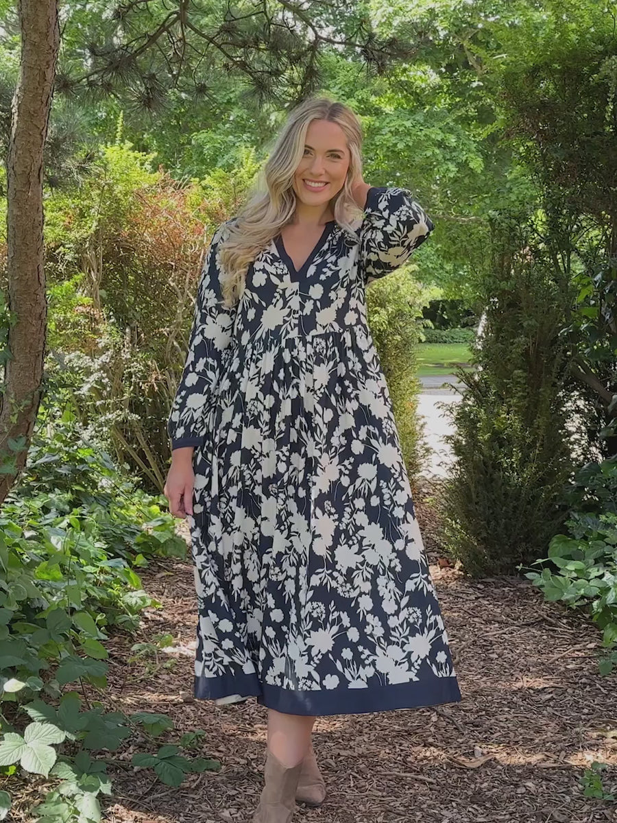 The Barbara Notch Neck Dress is an eye-catching dress, with a large navy and white floral print edged with a contrasting navy border. Made in a 100% sustainable viscose fabric this dress is super comfortable, and the tab and button sleeve design makes it super versatile, taking the sleeves from long to ¾ length instantly.