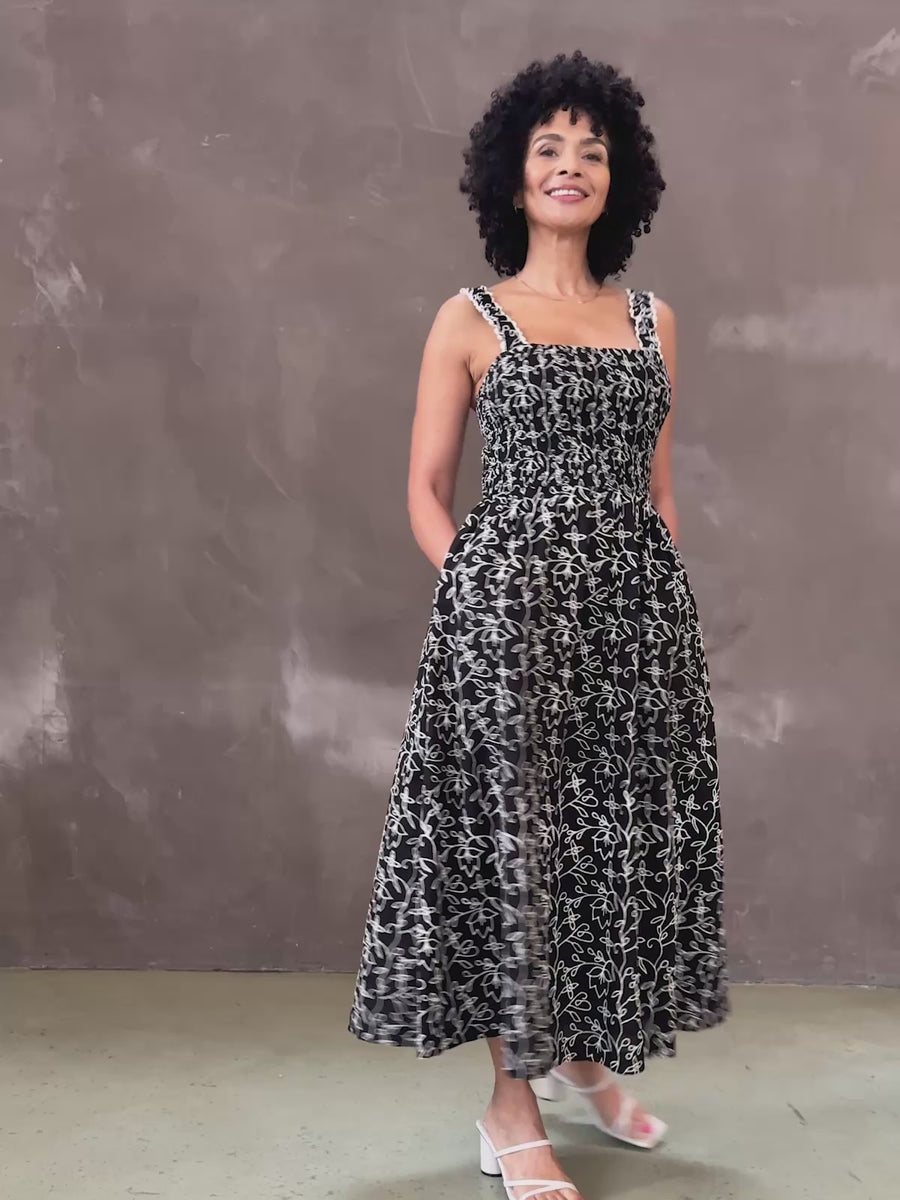 We can’t wait for some sun to wear the stunning new Fleur embroidered sundress. Fleur is the most gorgeous black cotton sundress elevated into something special thanks to the all over white floral embroidery fabric, fitted shirred elastic bodice, tiered maxi skirt and detailed straps.