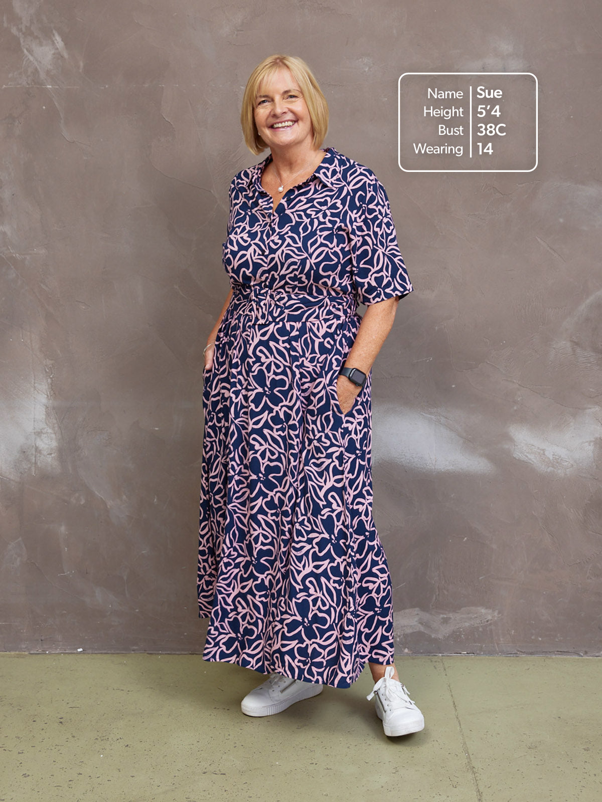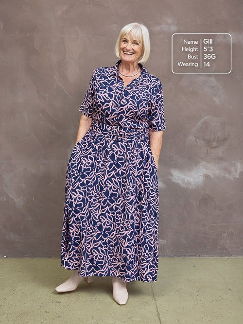 Returning by popular demand, our perennially fashionable Camilla shirt dress is one of our dressier options, and has been re-imagined in a beautiful, bold navy/pink linear floral print fabric.