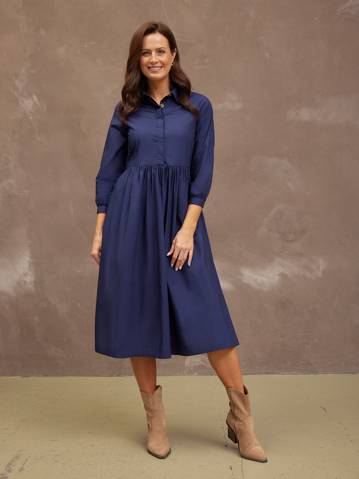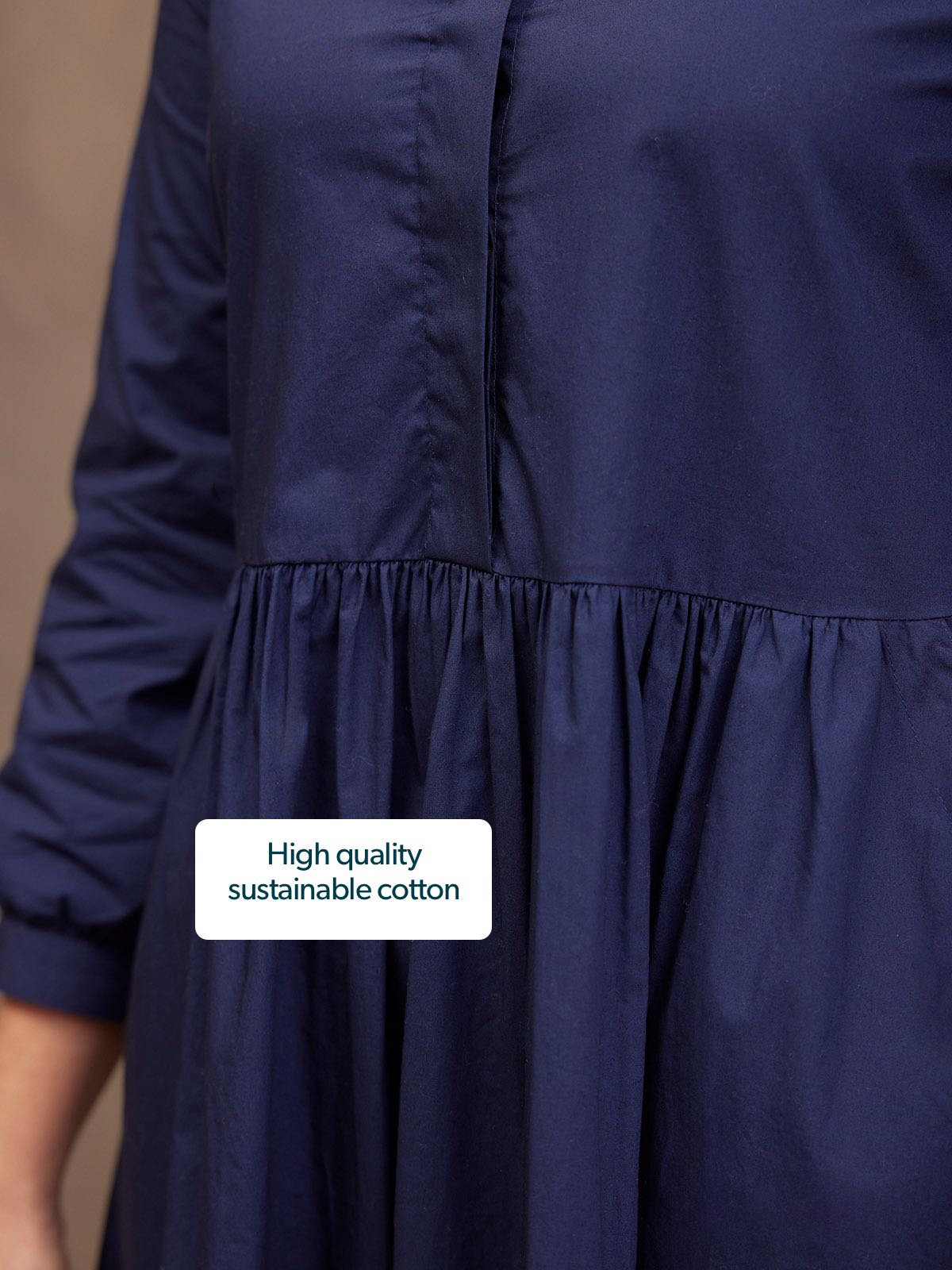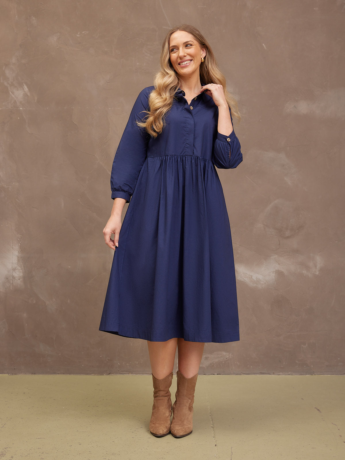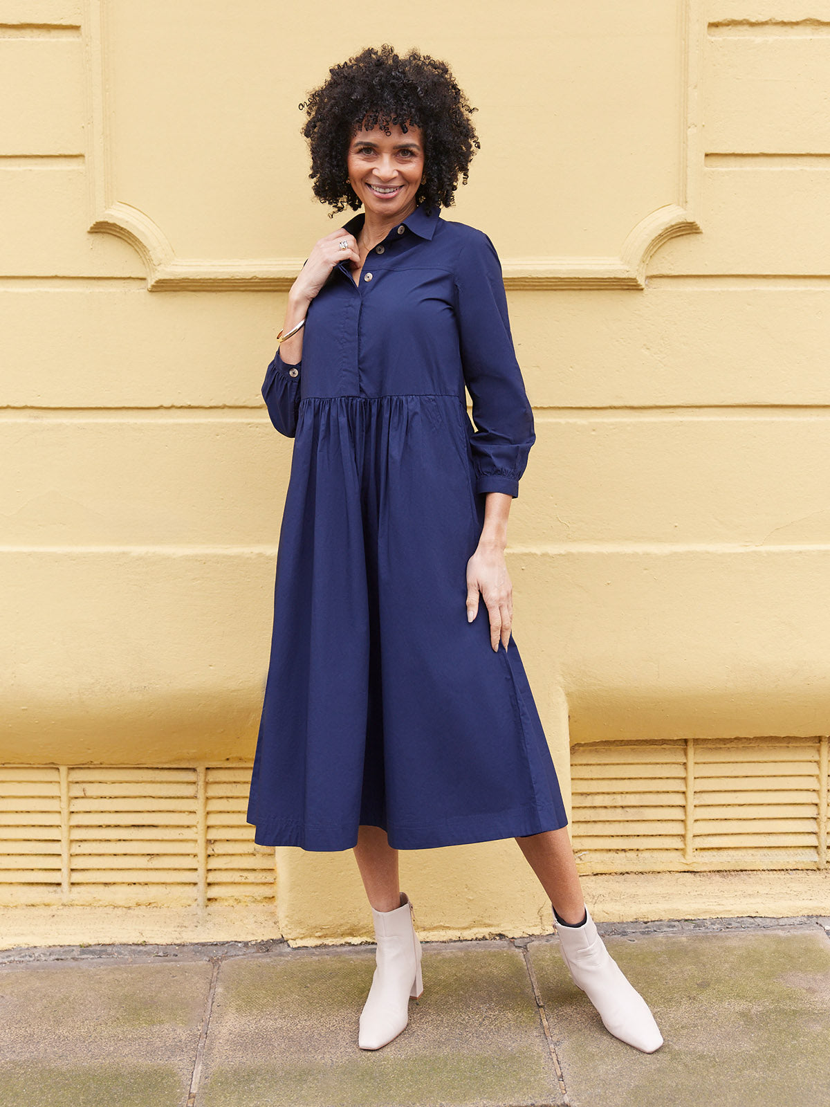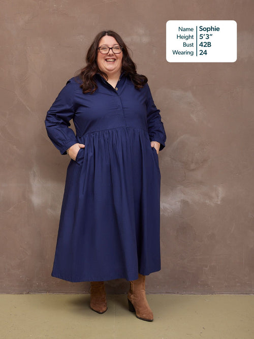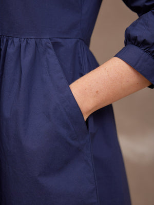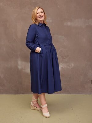Based on our best-selling Daisie denim dress - Katrina is our new 100% cotton poplin version, a classically beautiful navy shirt dress featuring a shirt collar and full gathered skirt. The lovely rich navy colour, and the sustainable cotton poplin fabric makes this a super versatile shirt dress, perfect for the coming warmer months.