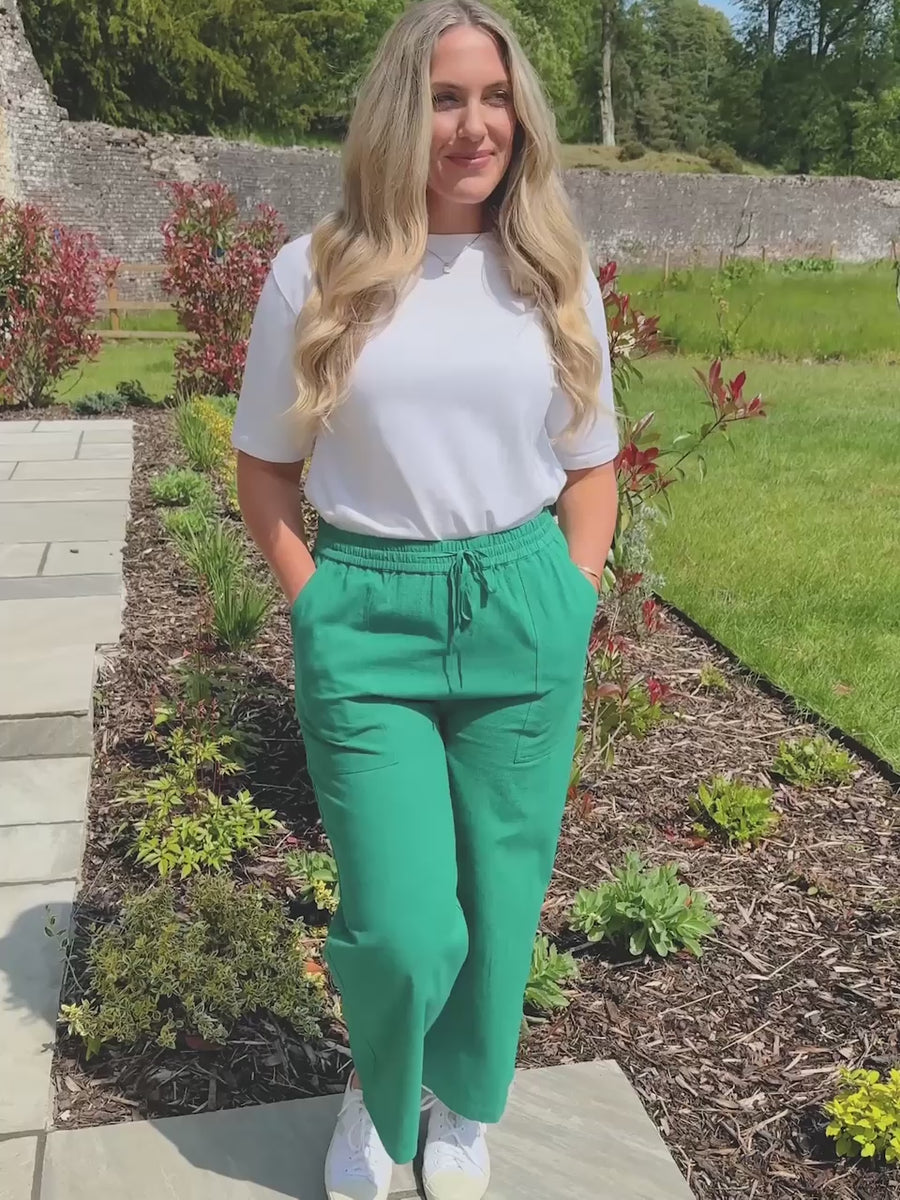 We wanted to make the perfect day to day pair of trousers - with Isha we might just have done it! Made in a soft structured cotton linen fabric and coming in two colourways - this green or a rich classic navy, these relaxed straight-legged full-length trousers are the perfect blend of comfort and style.