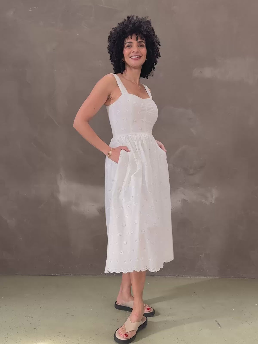 Made in sustainable white cotton broderie anglais with a fitted bodice and floaty skirt, the Eloise has pockets and lace trimmed (bra-hiding) straps making her not only stylish but easily wearable. The fitted bodice has a shirred elastic back and gathered bust ensuring the perfect fit for all.