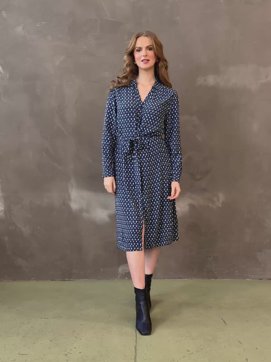 Lily comes in a navy and ivory ditsy geo print and is made in a sustainable woven viscose crepe - a soft fluid fabric.