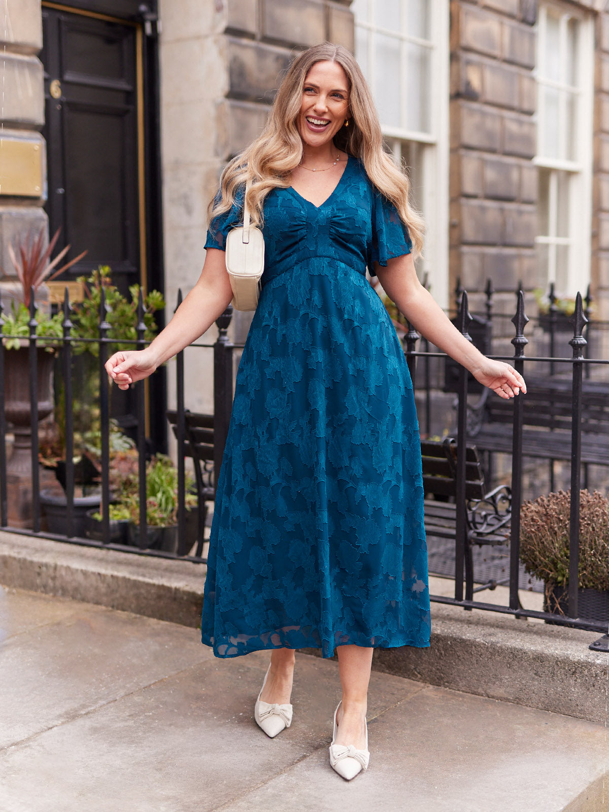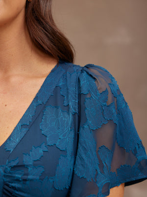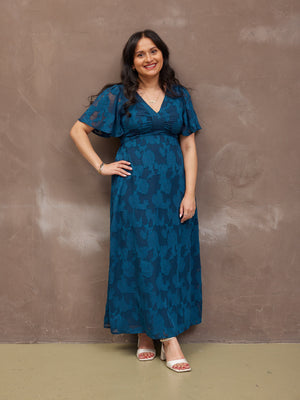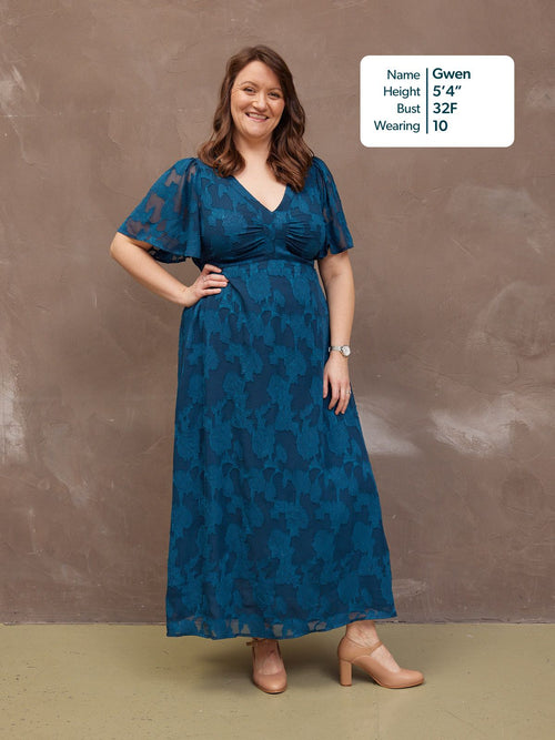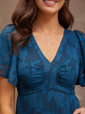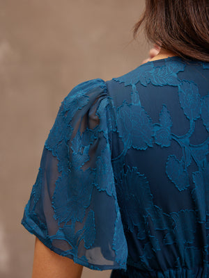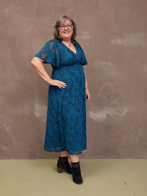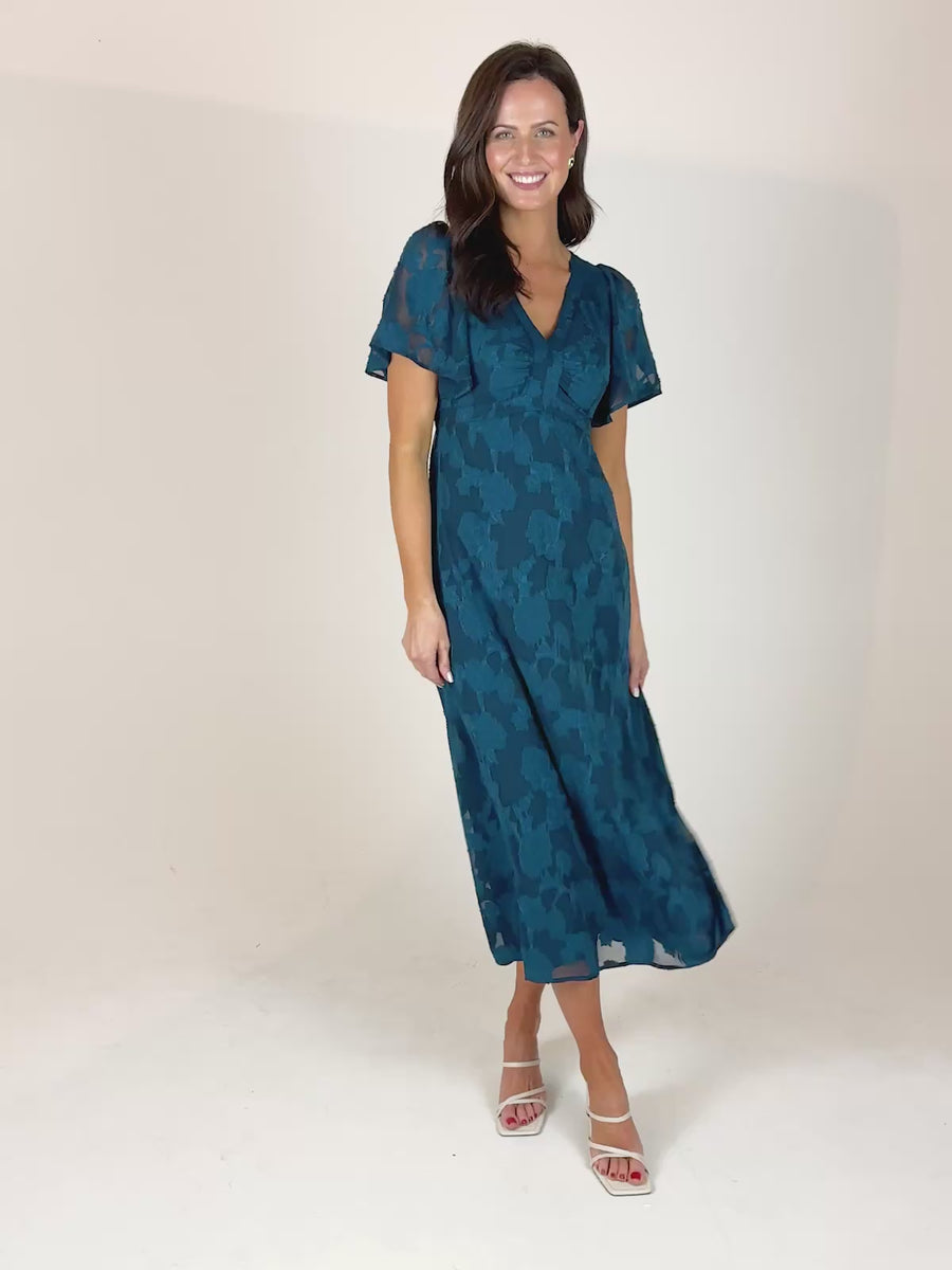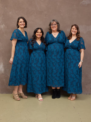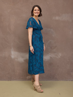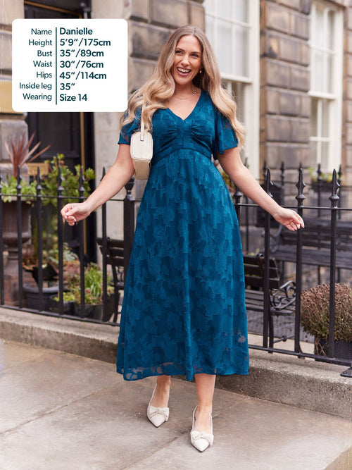 Introducing Helena: our new beautiful tea dress made in a stunning teal jacquard floral fabric. This really is a special event dress, thanks to its gorgeous semi sheer material, which is also beautifully soft and silky to touch.