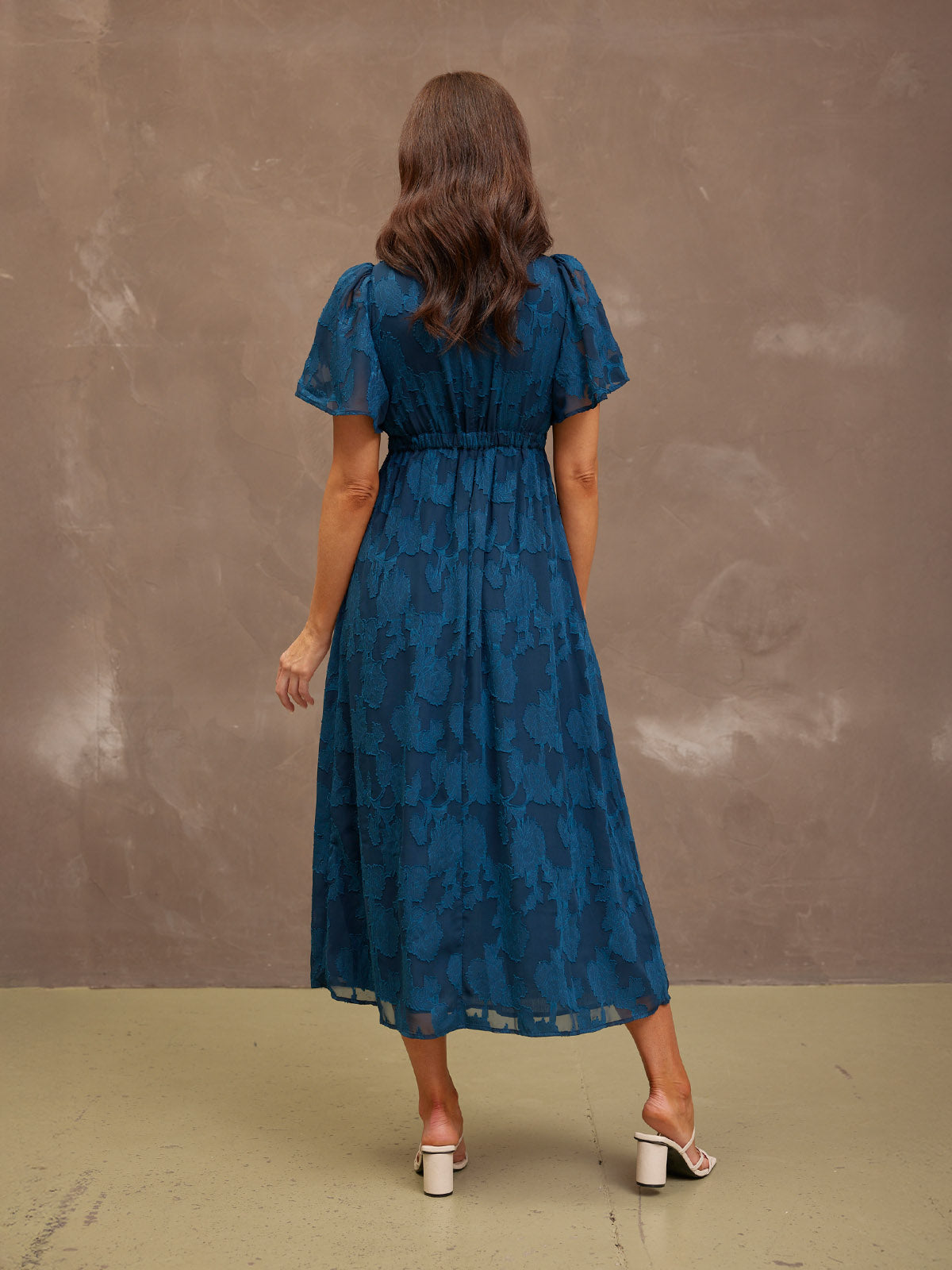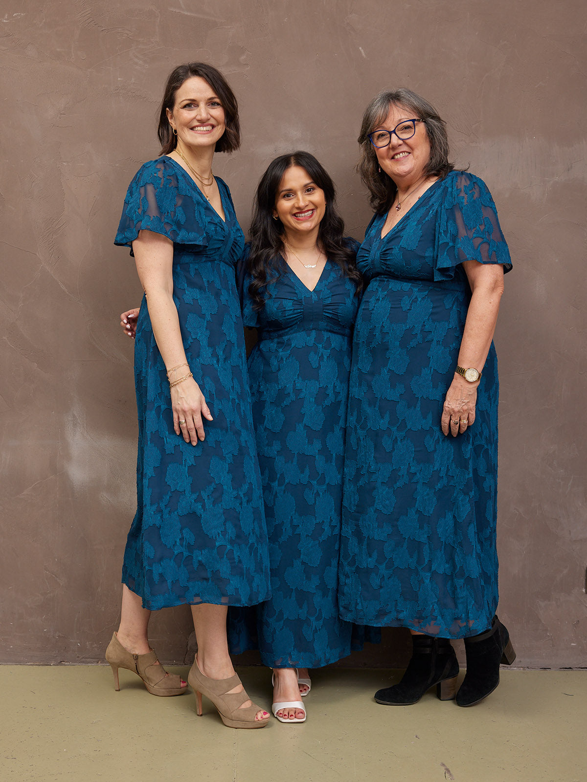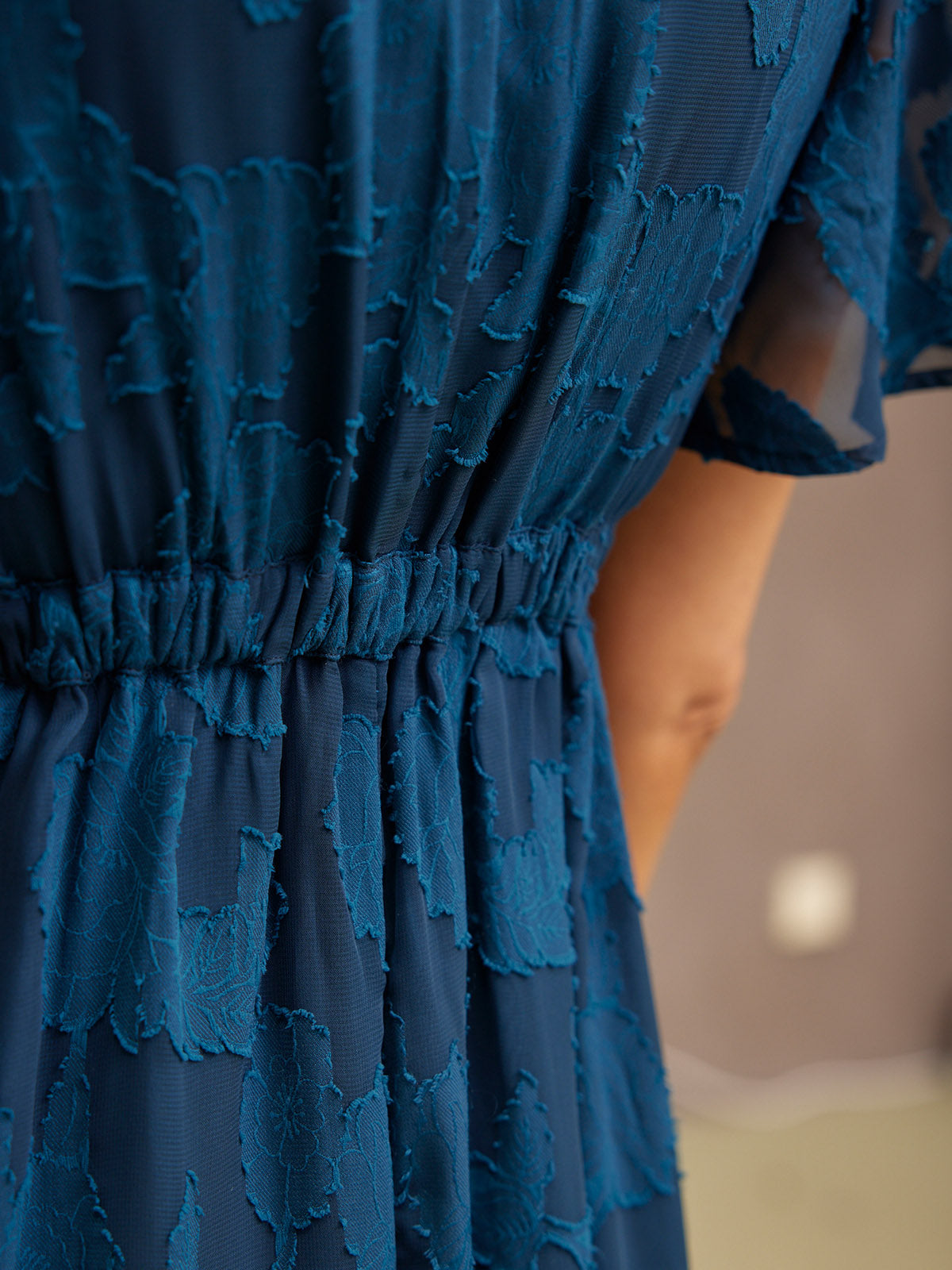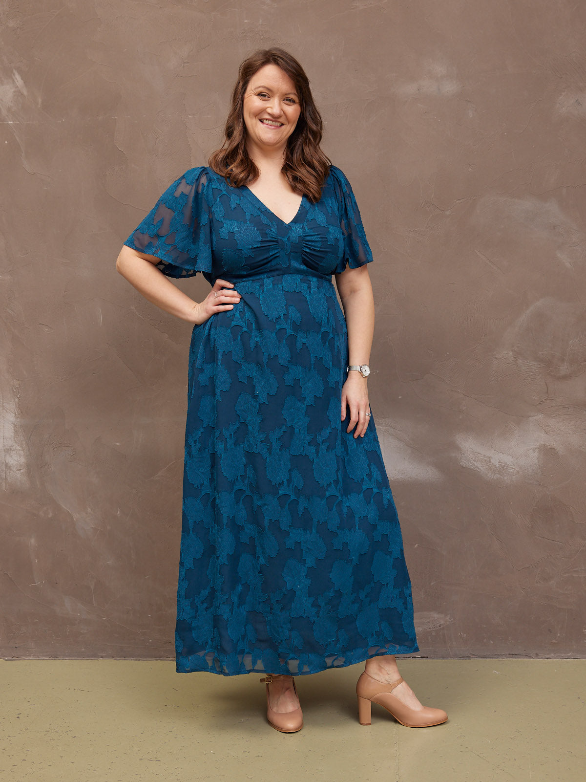 Introducing Helena: our new beautiful tea dress made in a stunning teal jacquard floral fabric. This really is a special event dress, thanks to its gorgeous semi sheer material, which is also beautifully soft and silky to touch.