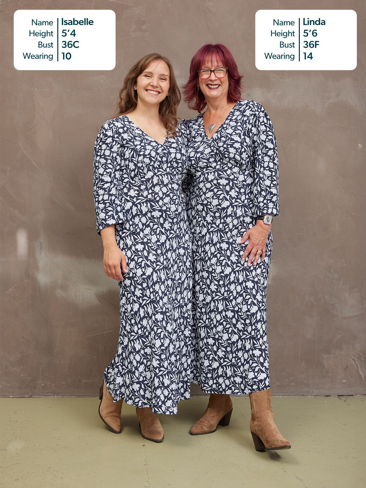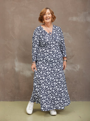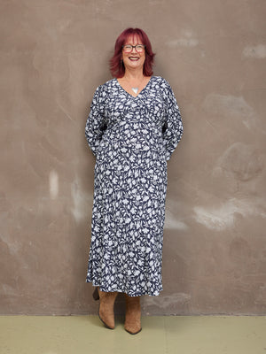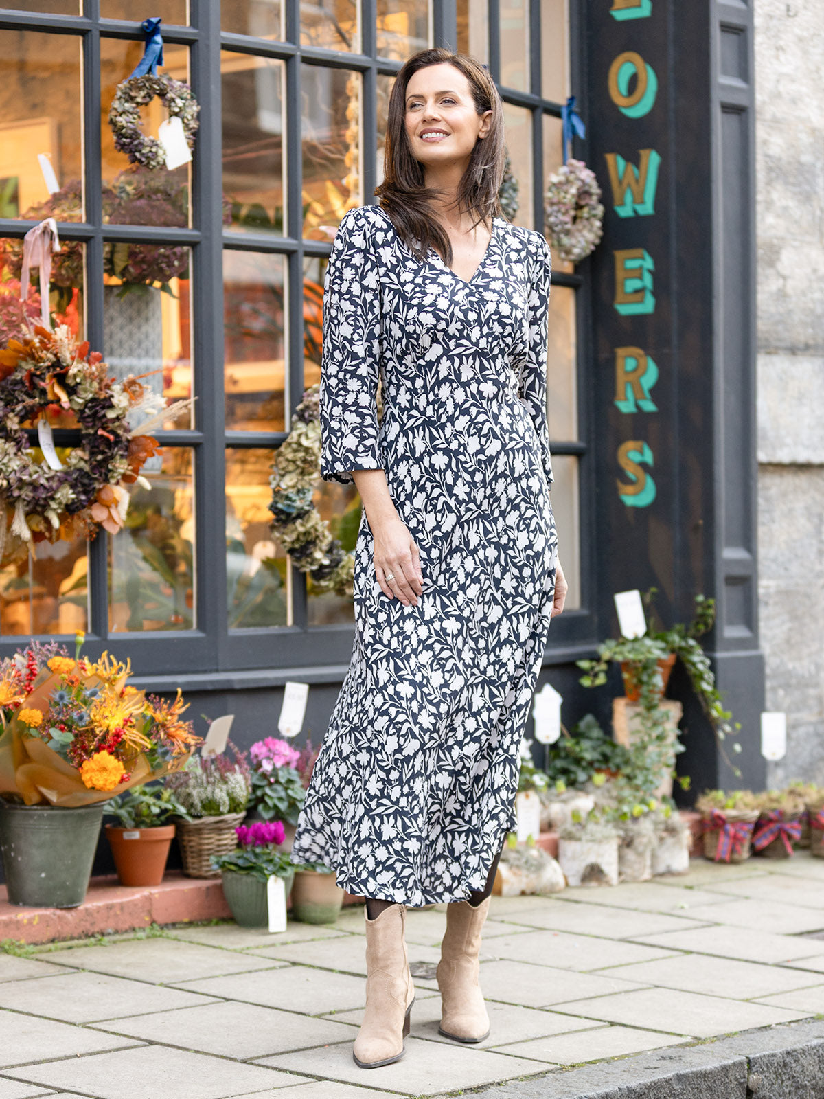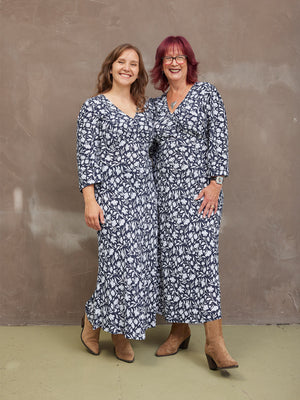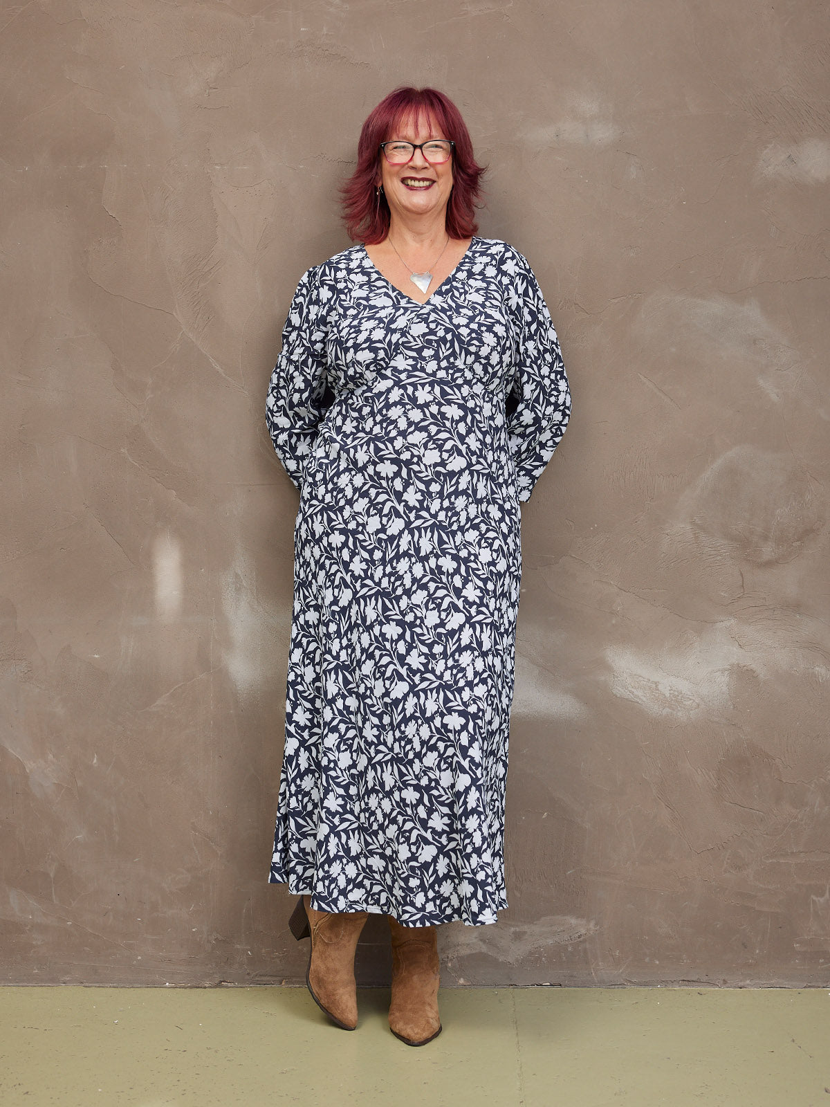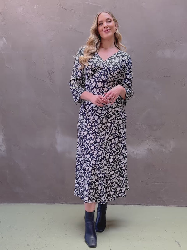 The Joanna is a new shape for us, designed with the help of 10,000 members in our amazing community. A flattering bias cut dress in a deep navy and white shadow floral print, the Joanna has a tie detail at the back to ensure a perfect flattering fit for all.