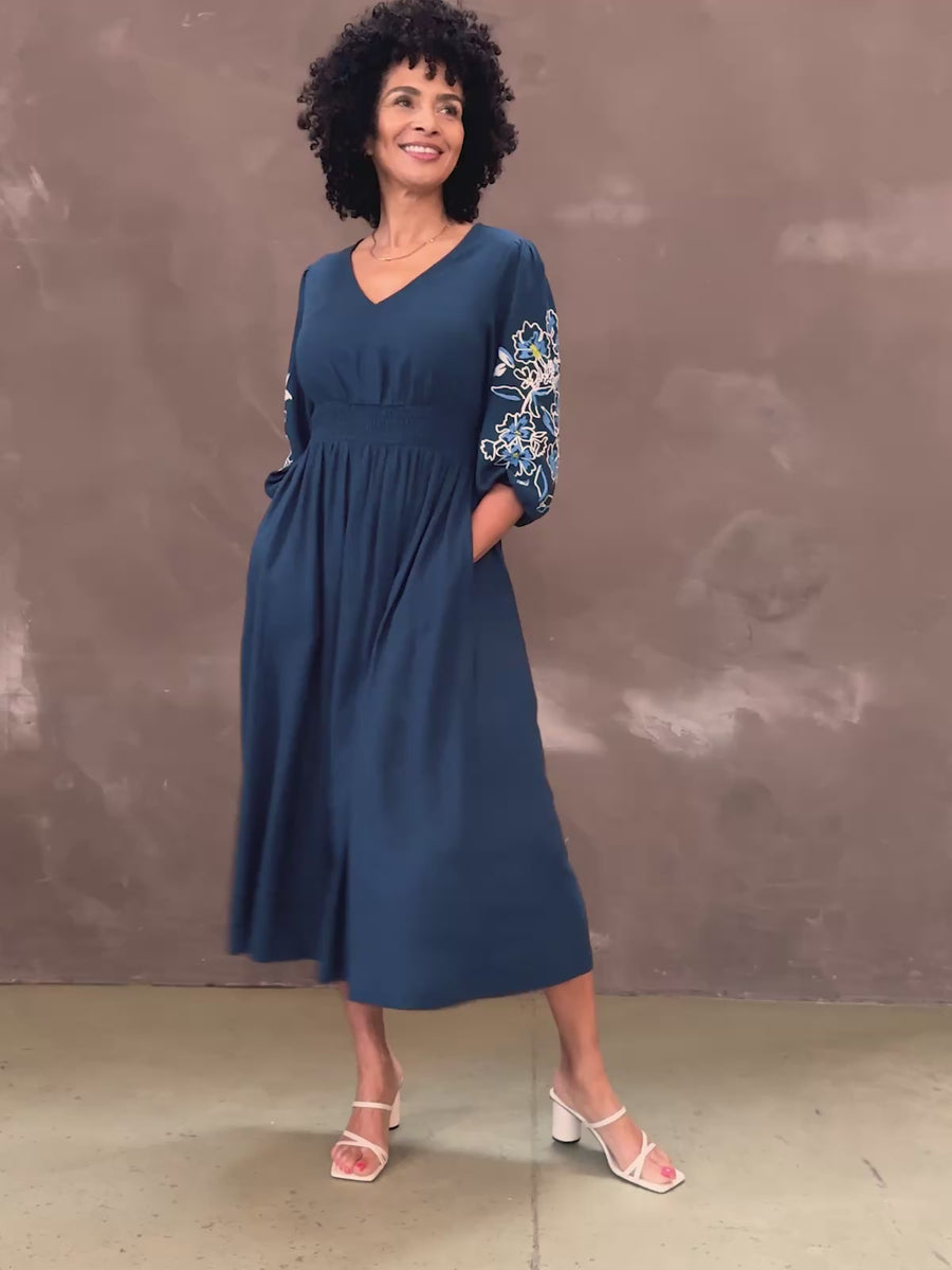 Made in a perennially classic navy woven viscose linen with a v-neckline, shirred waist and floaty skirt, it’s the blouson sleeves that really make this dress a cut above the rest thanks to their delicately embroidered blue flower design.