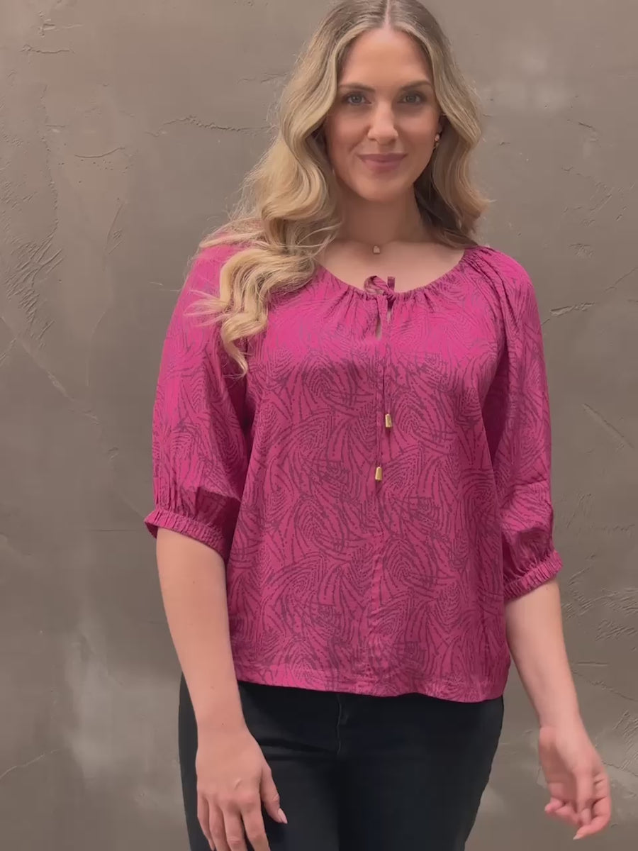 Made in a sustainable woven viscose crepe fabric, Lottie is the ultimate easy-to-wear top; lightweight, super versatile and stylish. This sustainable top has ¾ length sleeves and a relaxed A-line silhouette combined with a gold beaded drawcord neckline that can be worn tied or open.