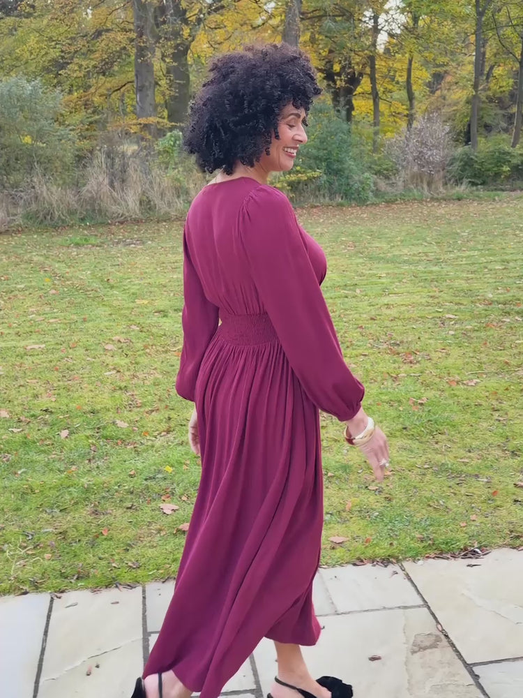 Our new Maddie Burgundy dress is made in a sustainable woven viscose crepe fabric, which is a beautiful, light, floaty and amazing to touch material. Gorgeously versatile, this sustainable dress has elasticated cuffs, long blouson sleeves and of course, those all-important pockets. Maddie is the ultimate trans-seasonal dress, working equally well worn with thick tights and boots for the cold winter months as with a pair of crisp white trainers for a relaxed bare legged look when the weather gets warmer. It is also a fabulously versatile dress that works just as well smartened up for a day in the office as dressed down for a day relaxing at home.