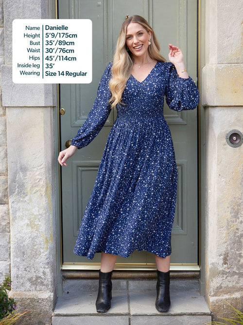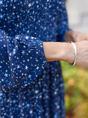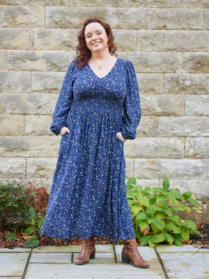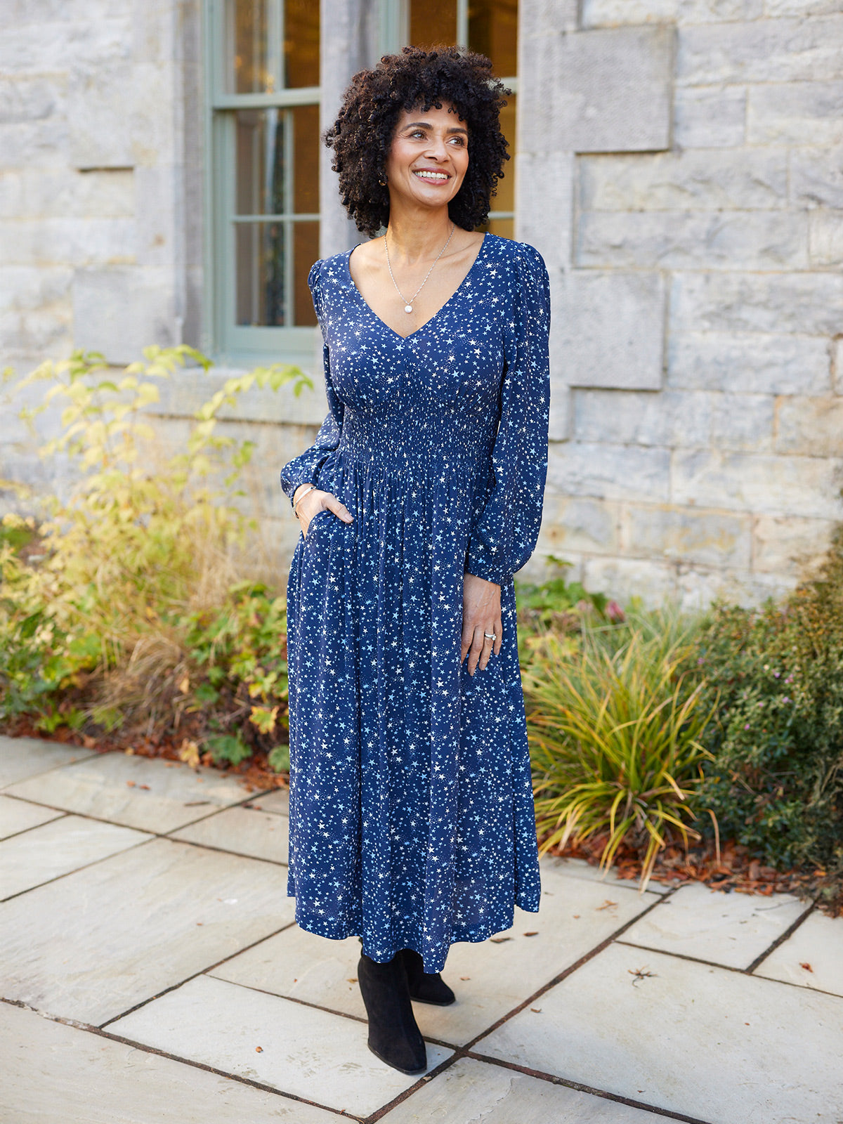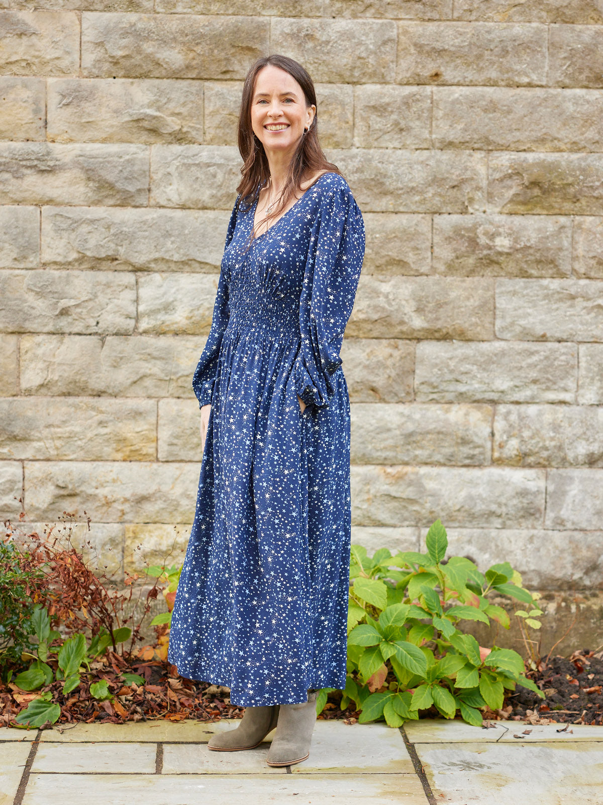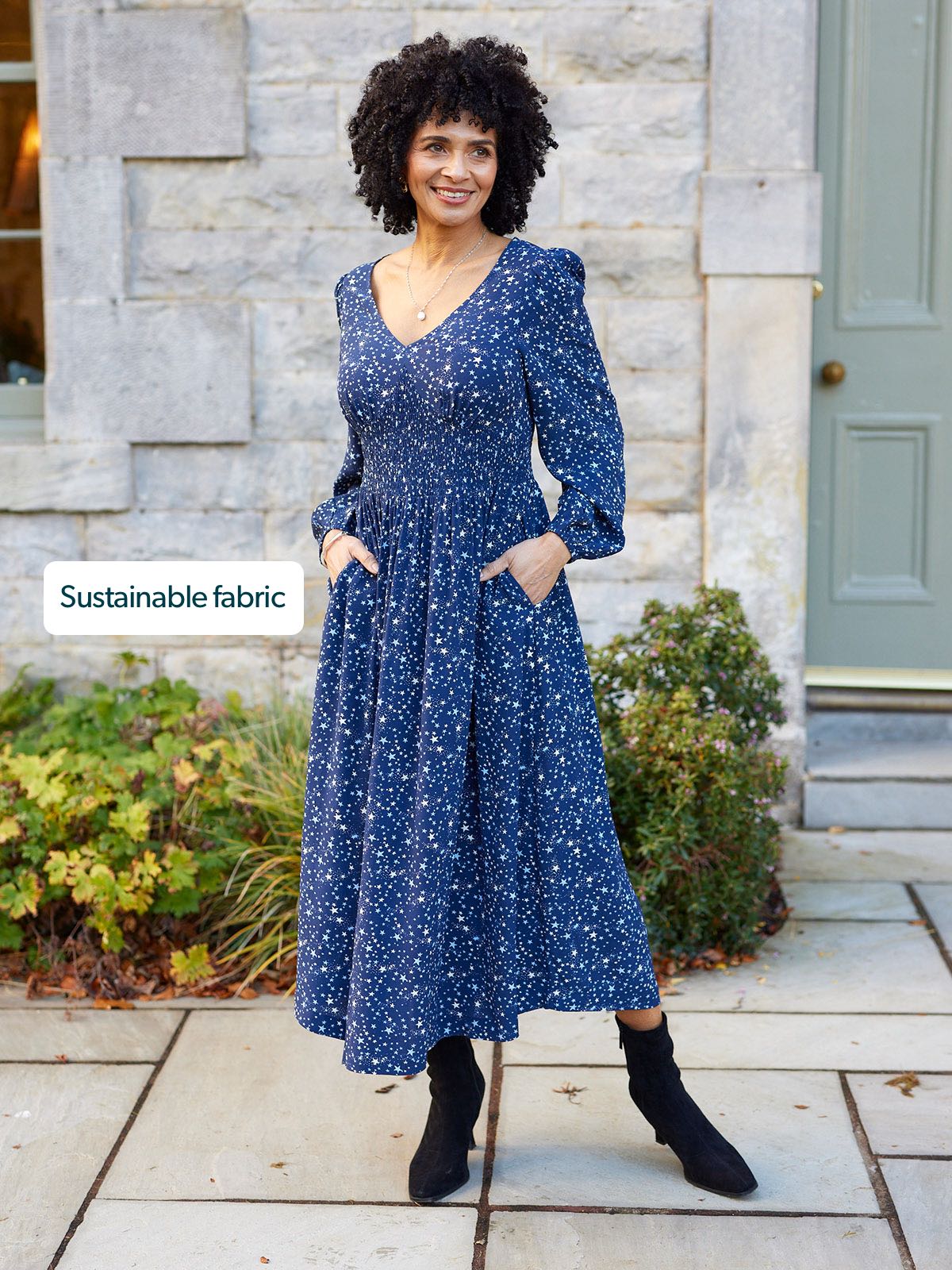 Our stunning Maddie Navy Star Print dress is made in a sustainable woven viscose crepe fabric, which is a beautiful, light, floaty and amazing to touch material. Gorgeously versatile, this sustainable dress has elasticated cuffs, long blouson sleeves and of course, those all-important pockets. The Navy Star print design is both stylish and fun and can be styled in so many different ways - with a chunky pale blue knit and boots for a casual look or with a blazer and heels for more formal dressing.