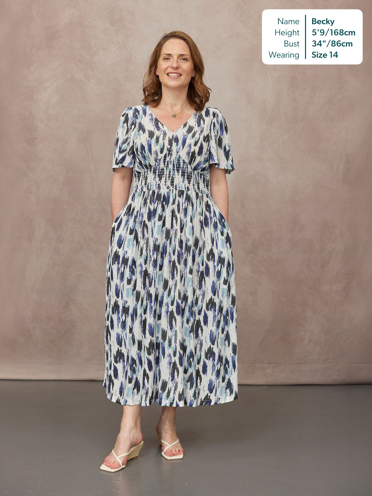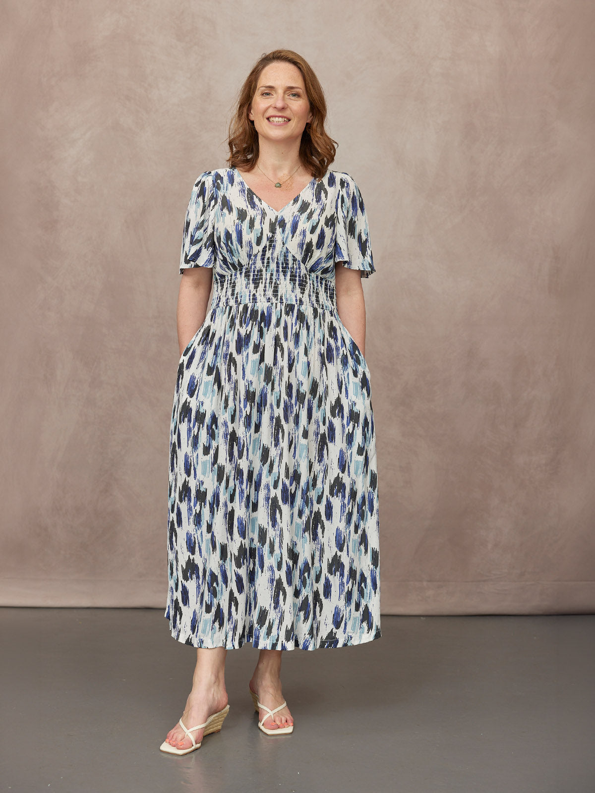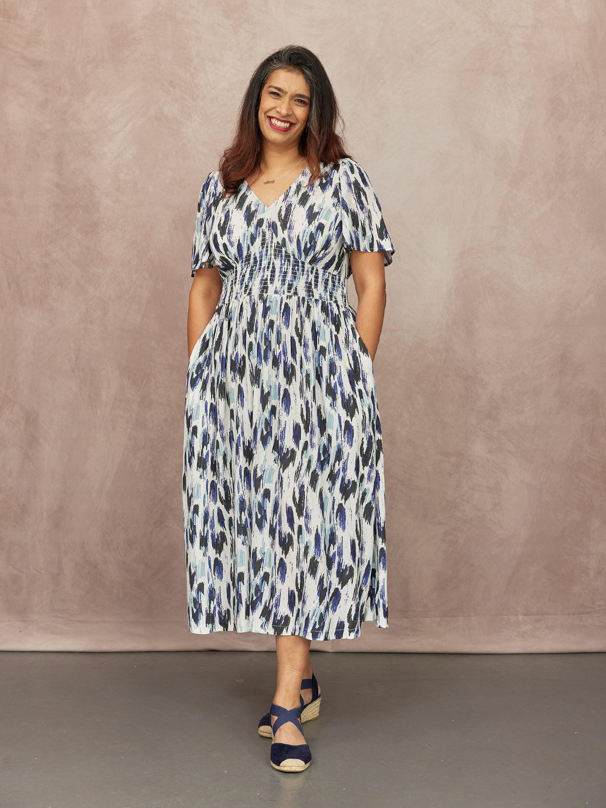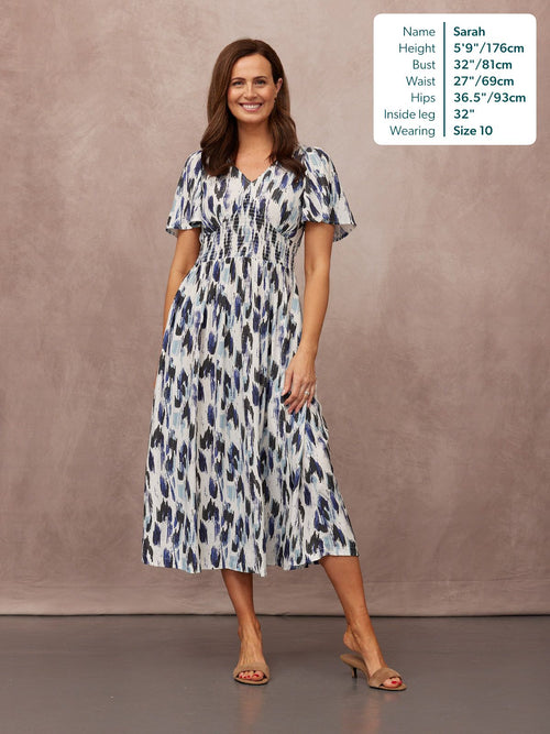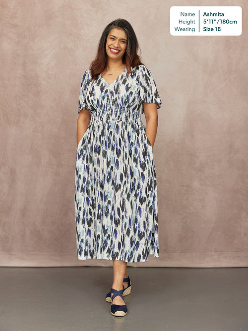 The navy Ikat print is a beautiful, sophisticated pattern that looks and feels special. Made in a sustainable woven viscose fabric - beautiful, light, floaty and soft to the touch - this Maddie with short angel sleeves and sizeable pockets is your perfect warm-weather companion. Wear with sandals and a straw bag for a holiday-ready look, style with trainers for an everyday outfit, or dress it up with a blazer and heels for a smarter occasion.