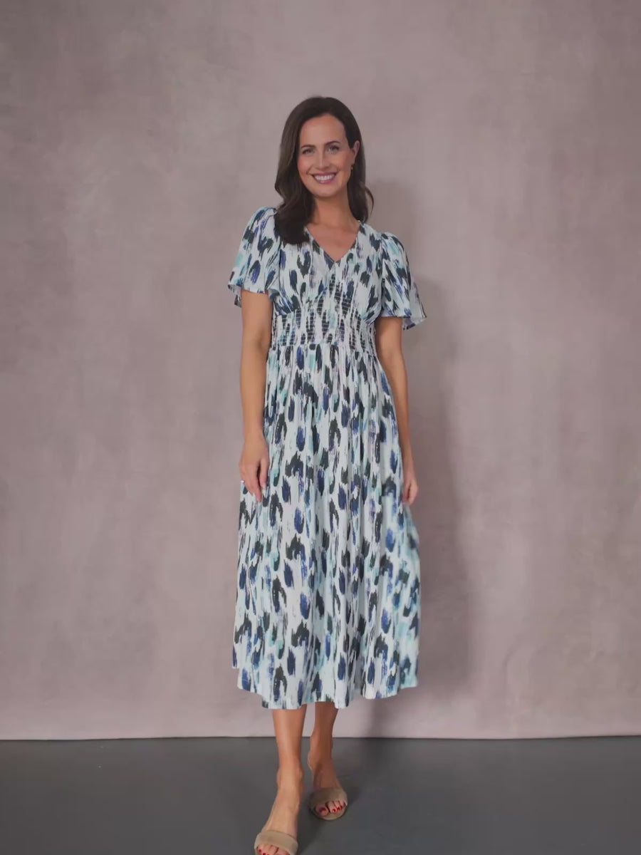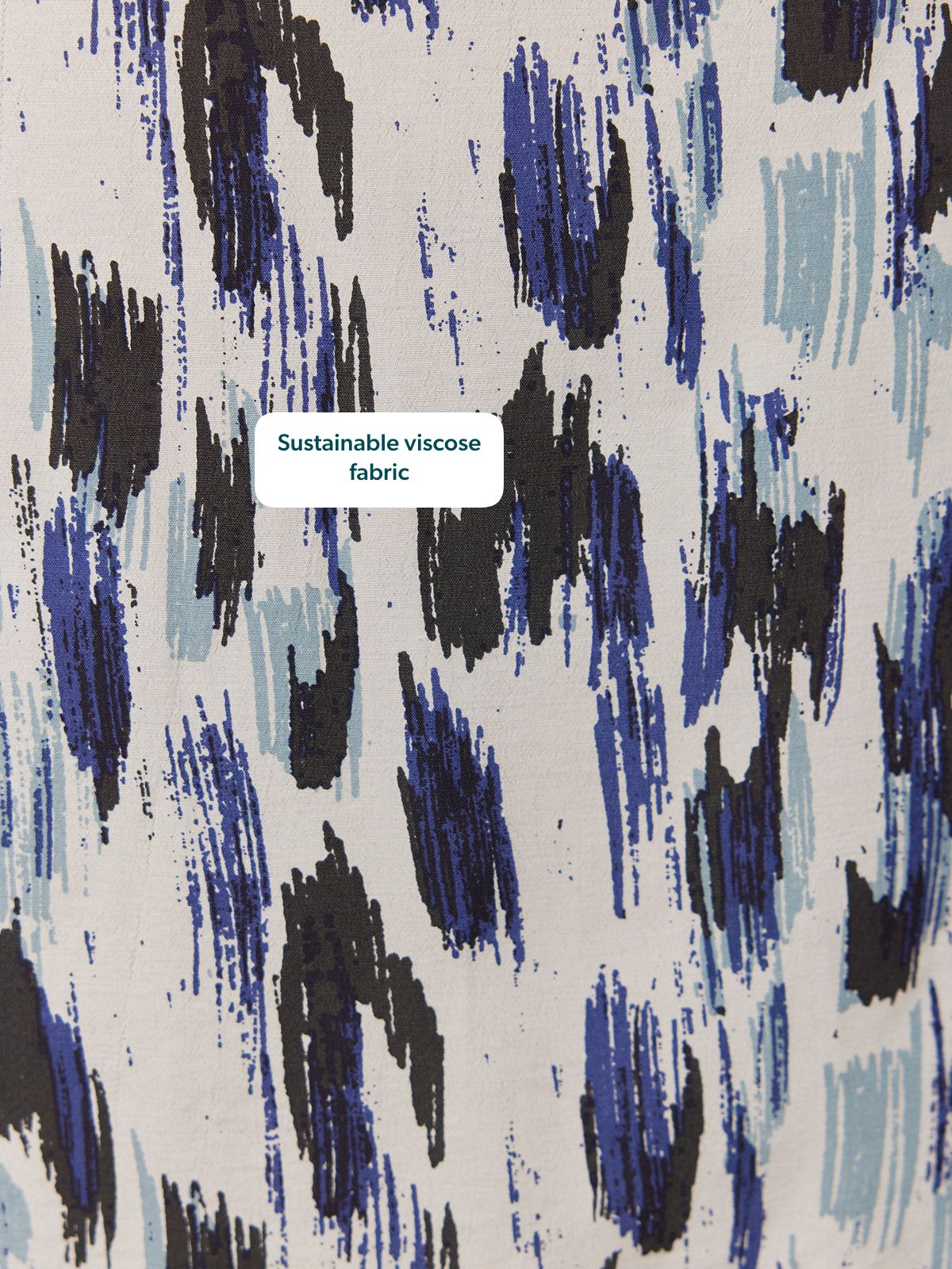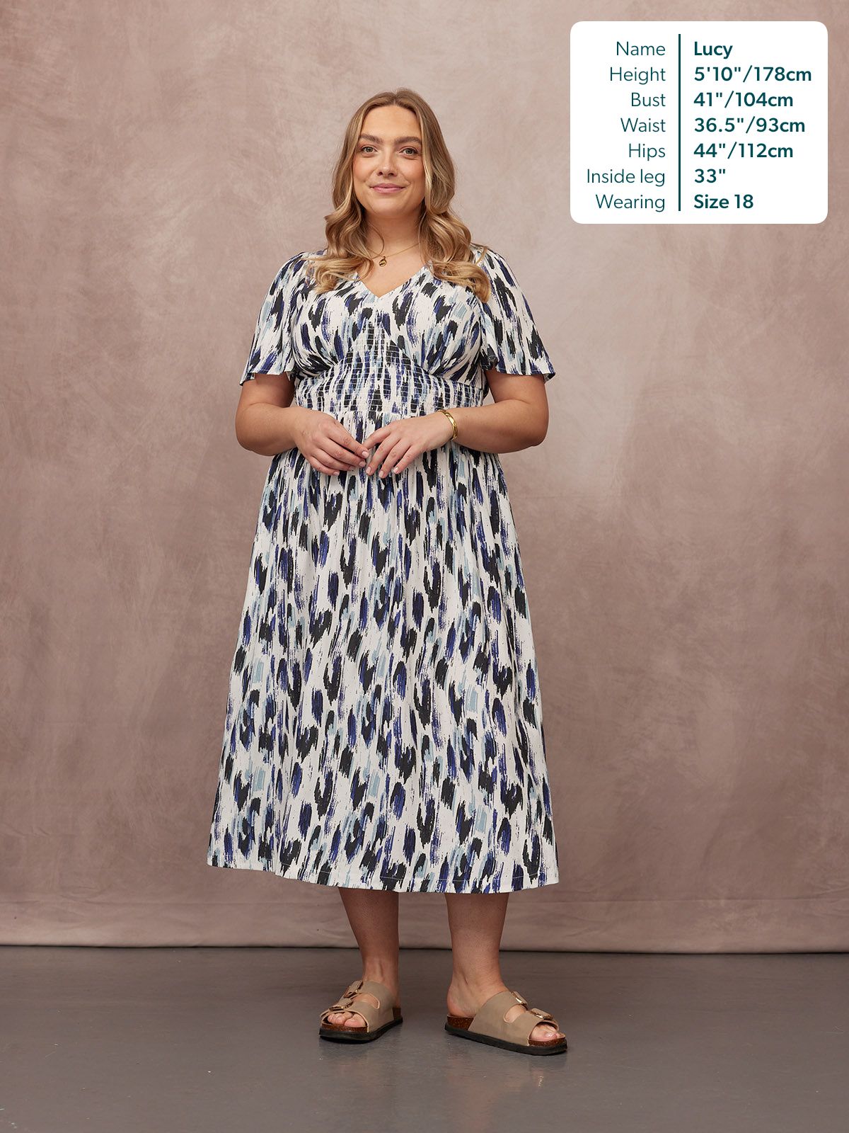 The navy Ikat print is a beautiful, sophisticated pattern that looks and feels special. Made in a sustainable woven viscose fabric - beautiful, light, floaty and soft to the touch - this Maddie with short angel sleeves and sizeable pockets is your perfect warm-weather companion. Wear with sandals and a straw bag for a holiday-ready look, style with trainers for an everyday outfit, or dress it up with a blazer and heels for a smarter occasion.