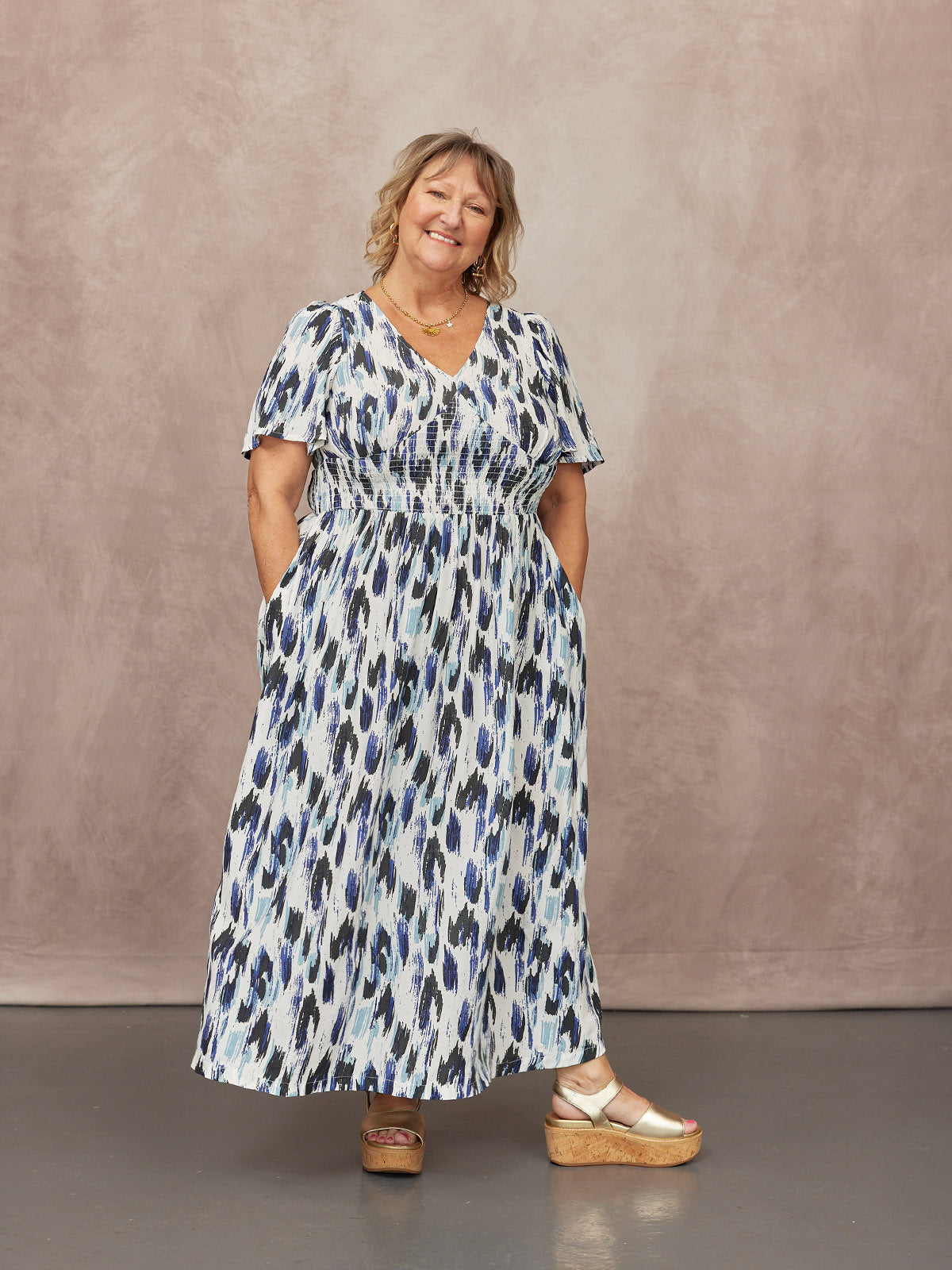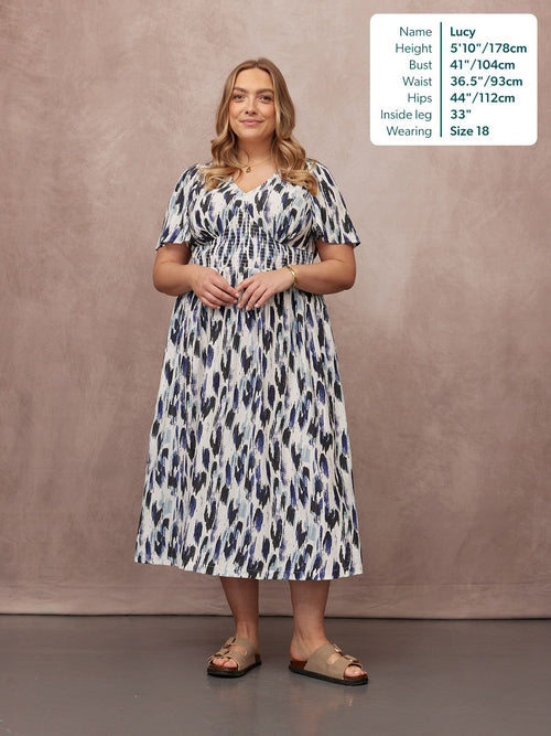 Maddie is our best-selling sustainable dress for a reason! Thousands of our customers have fallen head over heels for the Maddie shape and it's easy to see why - this is genuinely the most comfortable, most flattering dress we make! For this collection, Maddie is back in a gorgeous short sleeve style across three new prints, including this beautiful navy Ikat print that has a really elegant, boho feel to it.