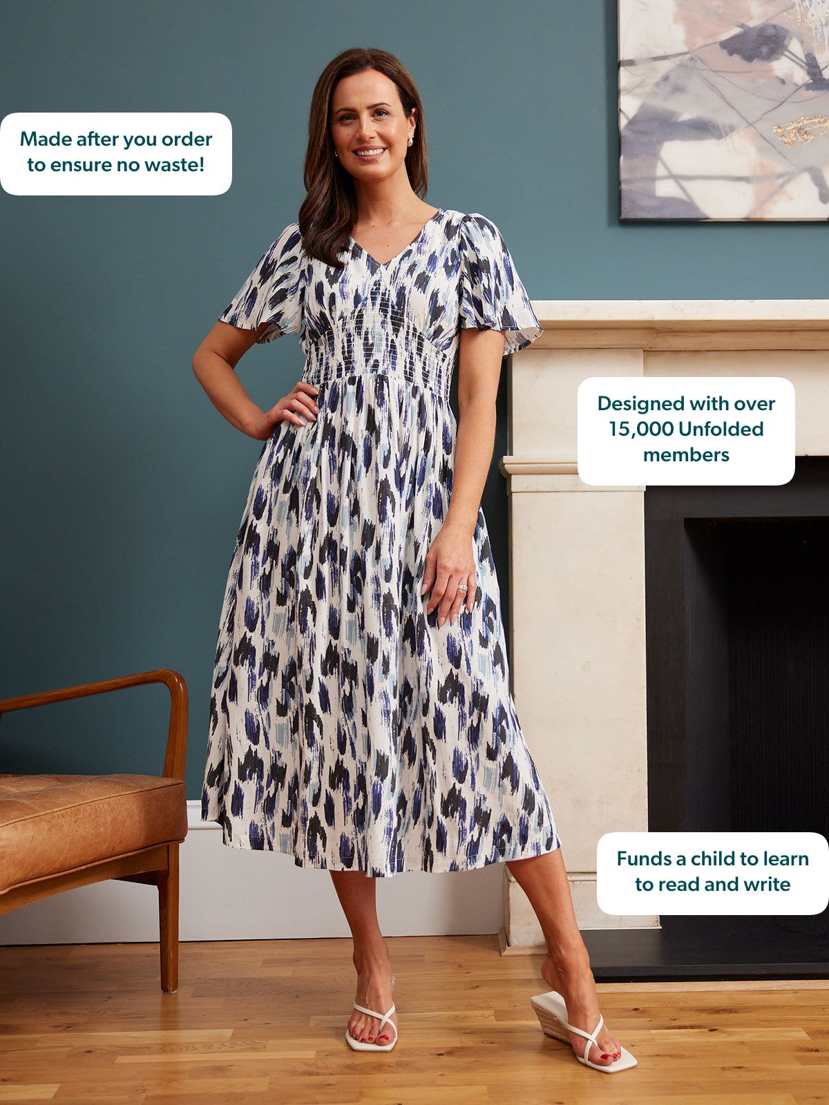 Buying this Maddie dress also means garment workers receive higher wages, and a child near our factories will be supported to learn to read and write for 2 months. Maddie is made to order but is still covered by our money back guarantee - we're that confident you'll love her!