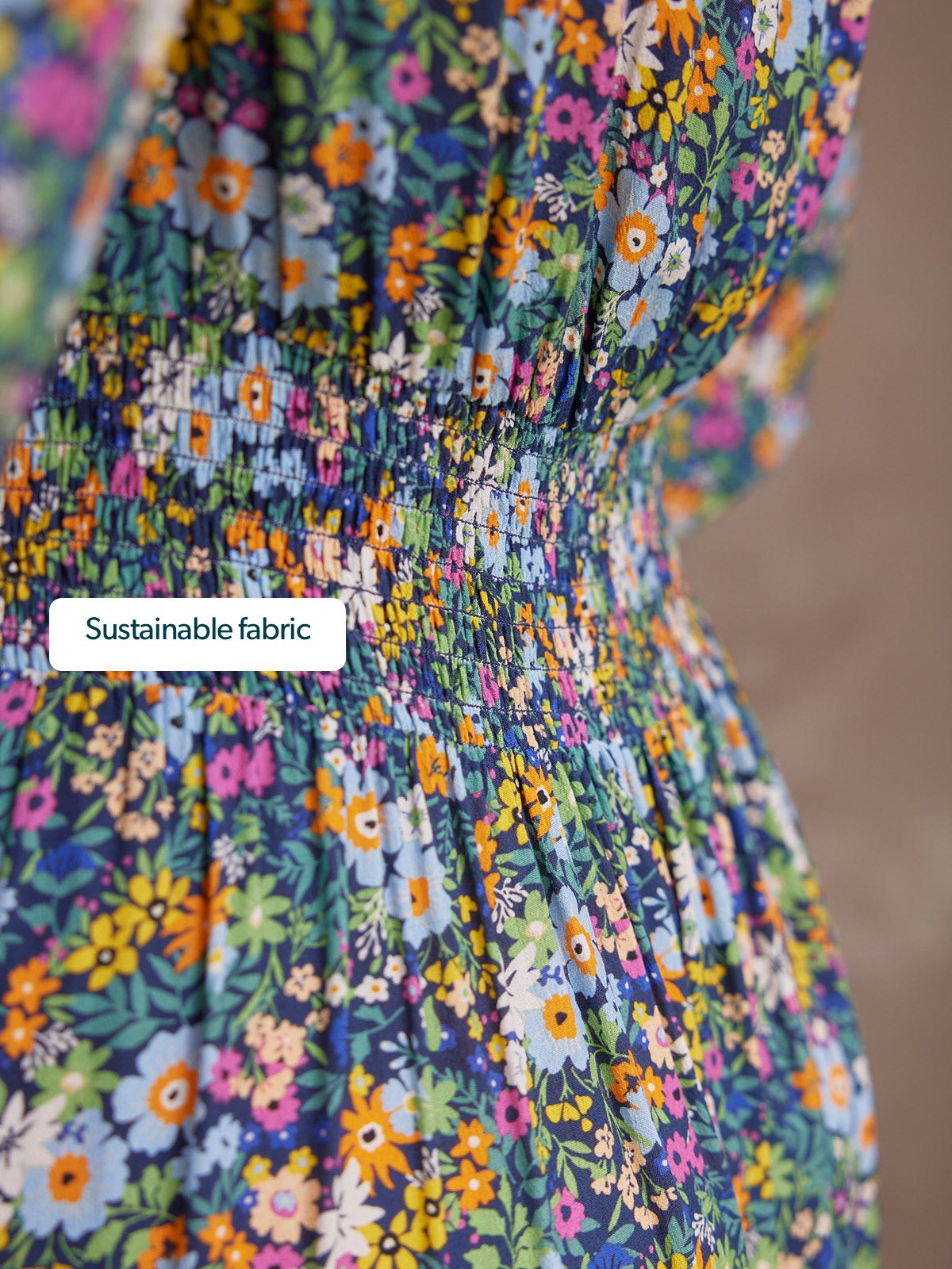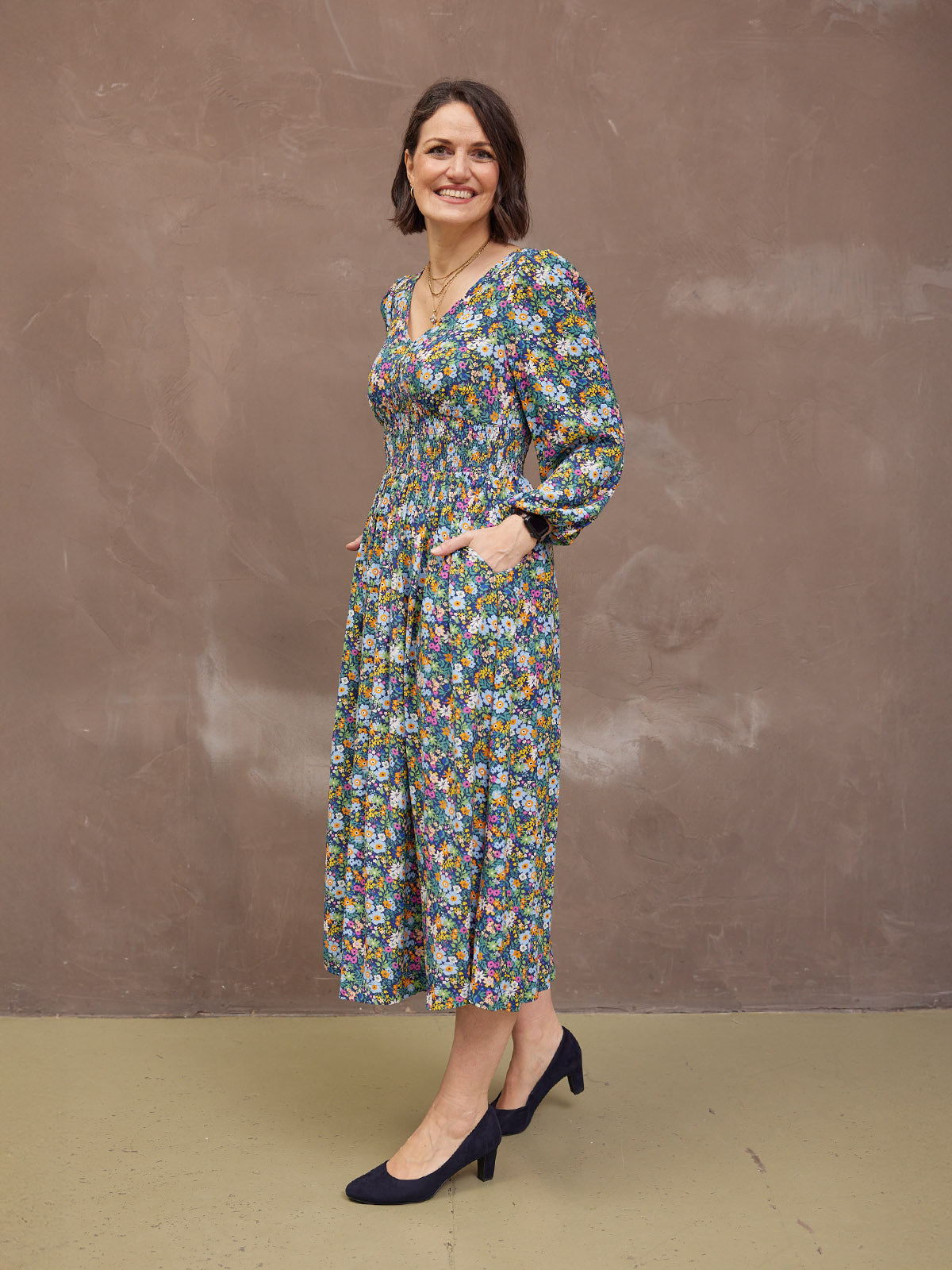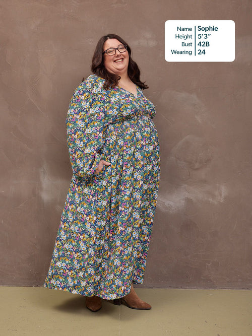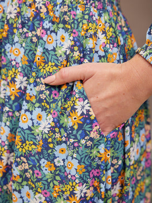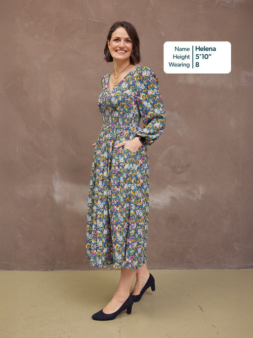 Our stunning new floral Maddie dress is made in a sustainable woven viscose crepe fabric, which is a beautiful, light, floaty and soft to touch material. Gorgeously versatile, this sustainable floral dress has elasticated cuffs, long blouson sleeves and of course, those all-important pockets. Maddie comes in two lengths, so you can get the fit that's right for you.