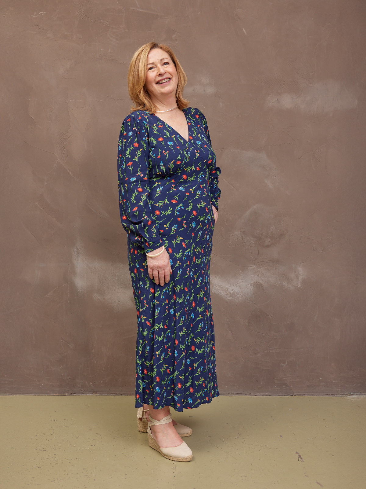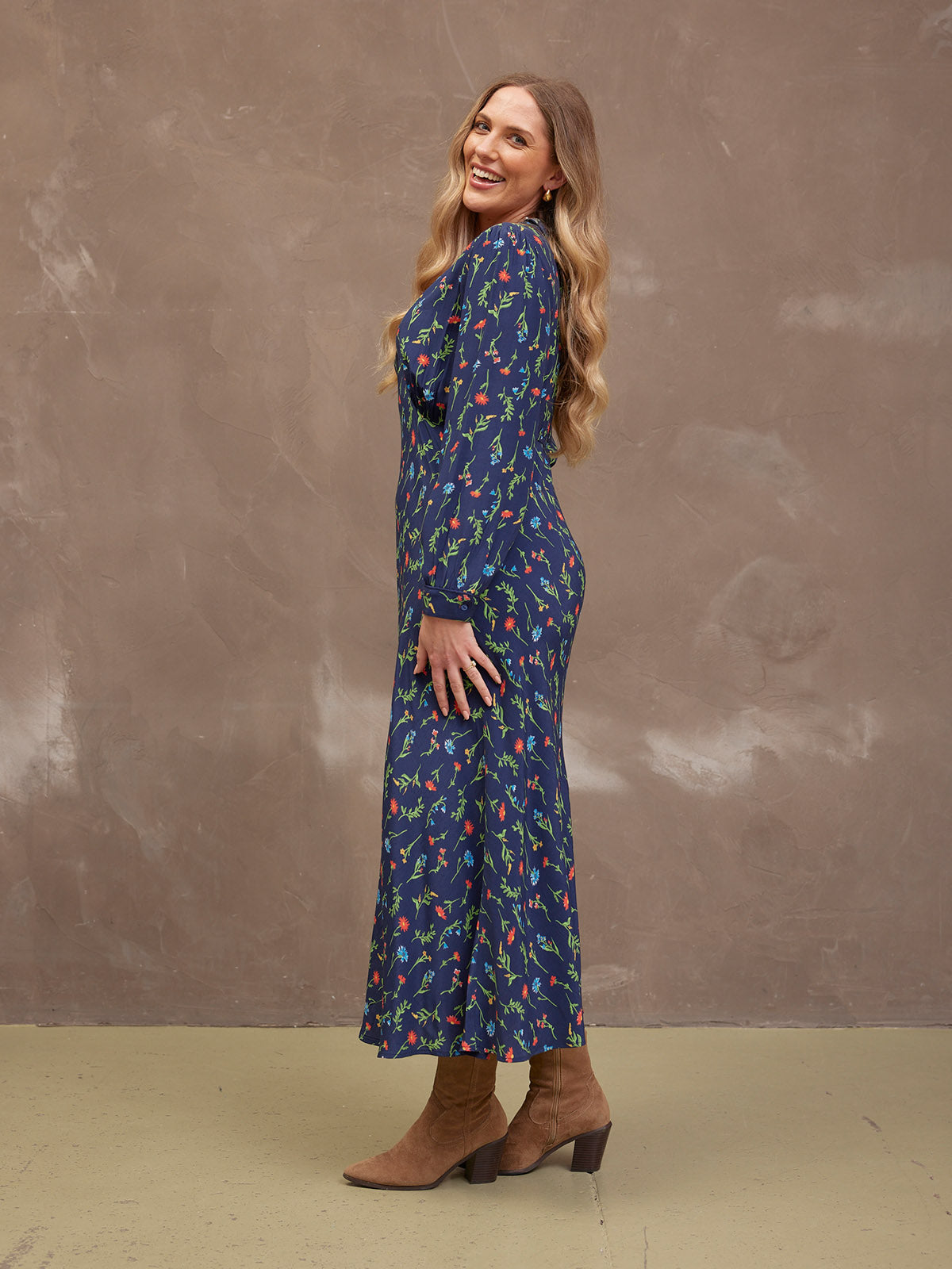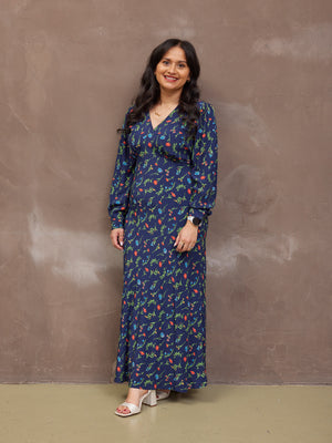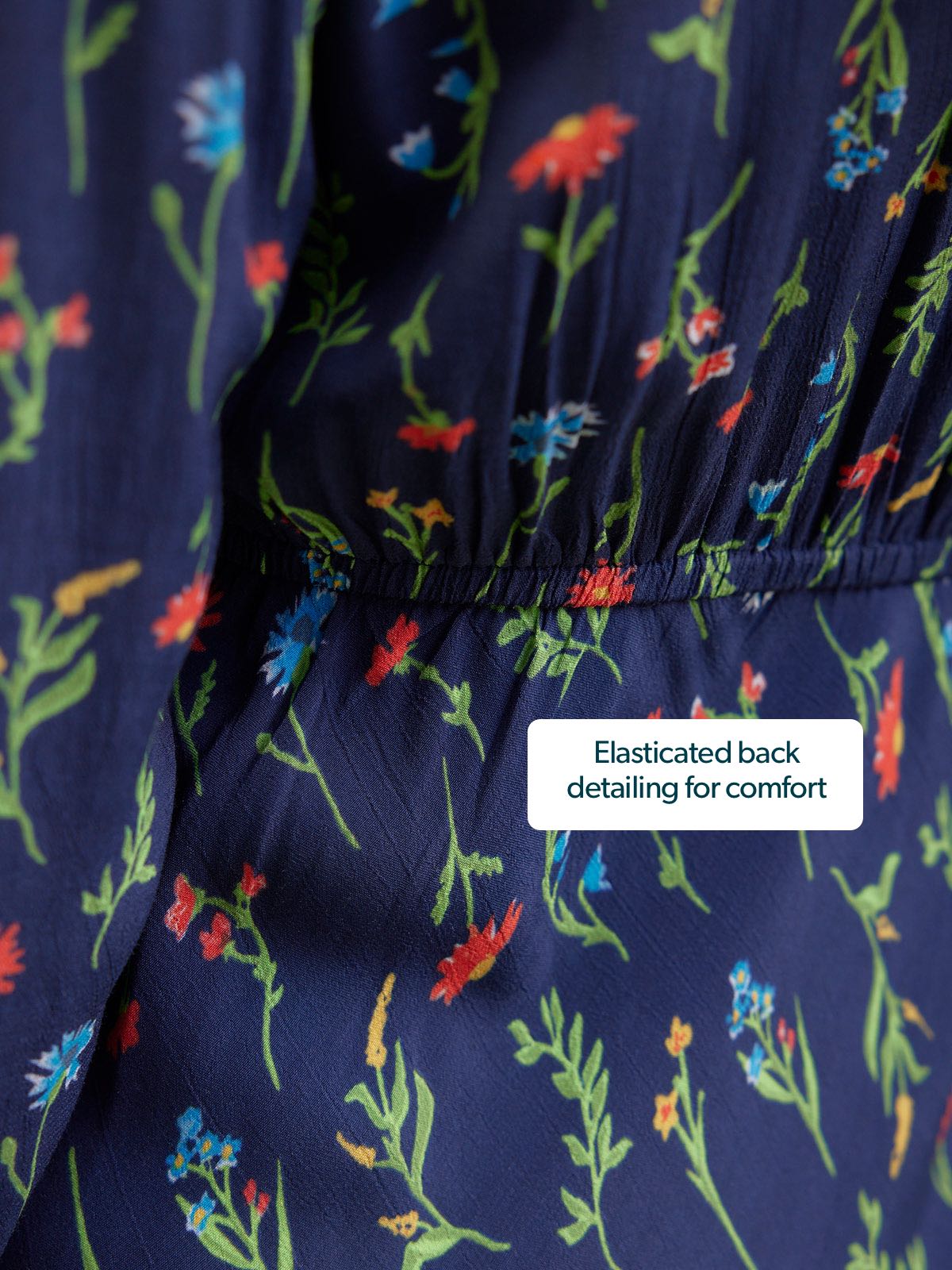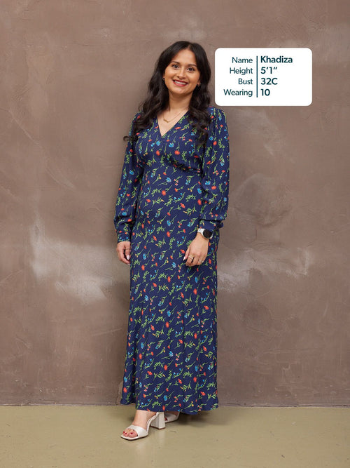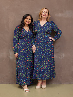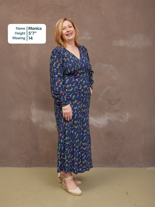 The gorgeous floral print is the same as our best-selling black floral Maddie dress, just updated with a navy background. Made in 100% sustainable viscose fabric, this dress is beautifully lightweight without being see-through. With a flattering bias cut shape, it benefits from under-bust shaping that carries onto a narrow elasticated band across the back. This ensures there is none of that annoying back material bunching, which you can sometimes get on bias-cut dresses.