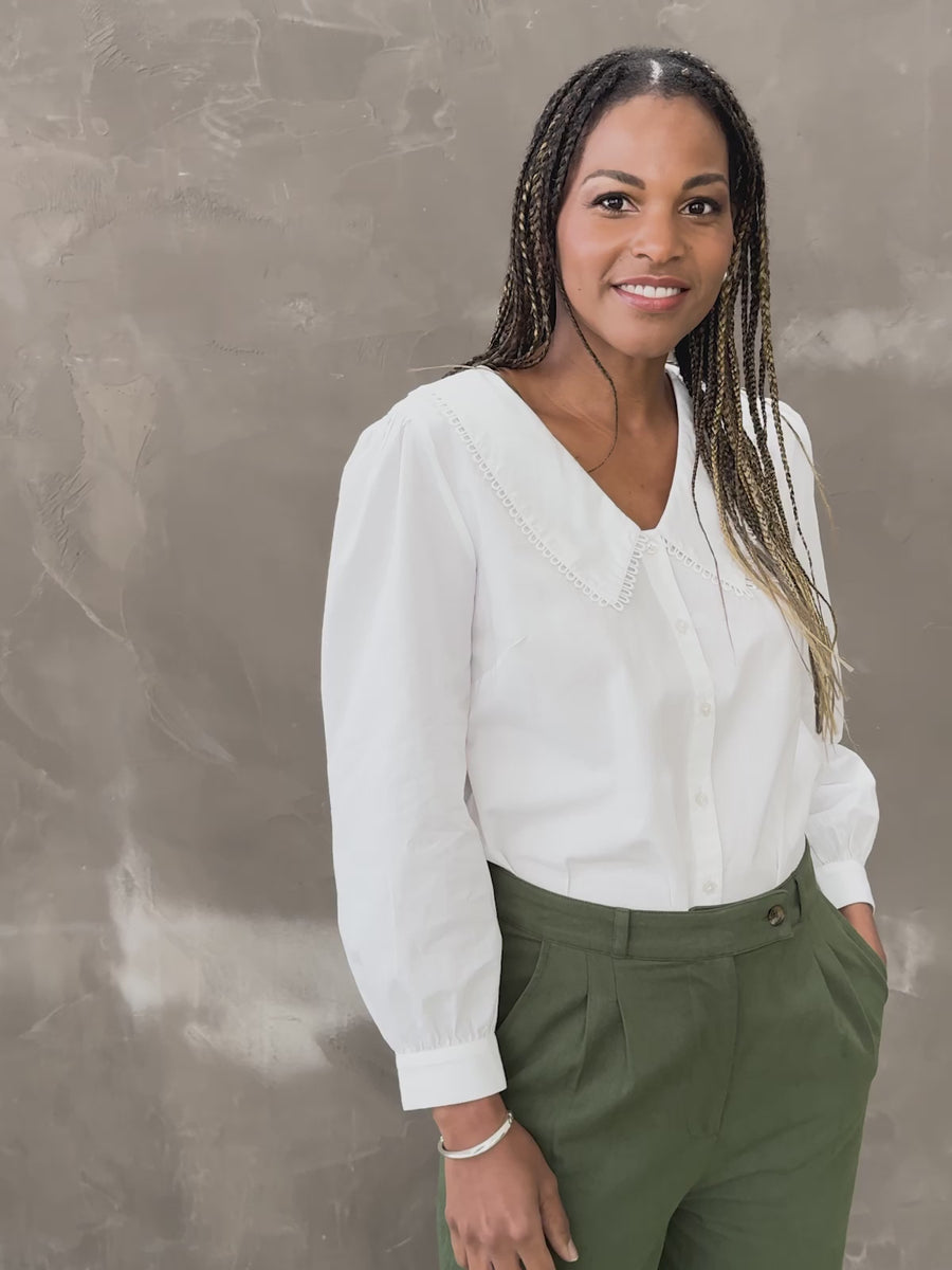 This shirt is made from a high quality white poplin and while the collar might be oversized the body is a regular fit. The beautiful blouse has a v-neck collar with lace trim detail and rollable buttoned cuffs, creating a beautiful silhouette and making it a simple yet stylish way to update any look. Personally we think it goes just as well with our Maya trousers, our soon-to-launch cord range and our bestselling Lana trousers!