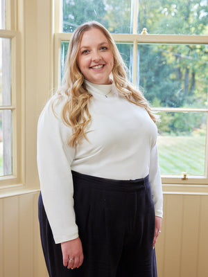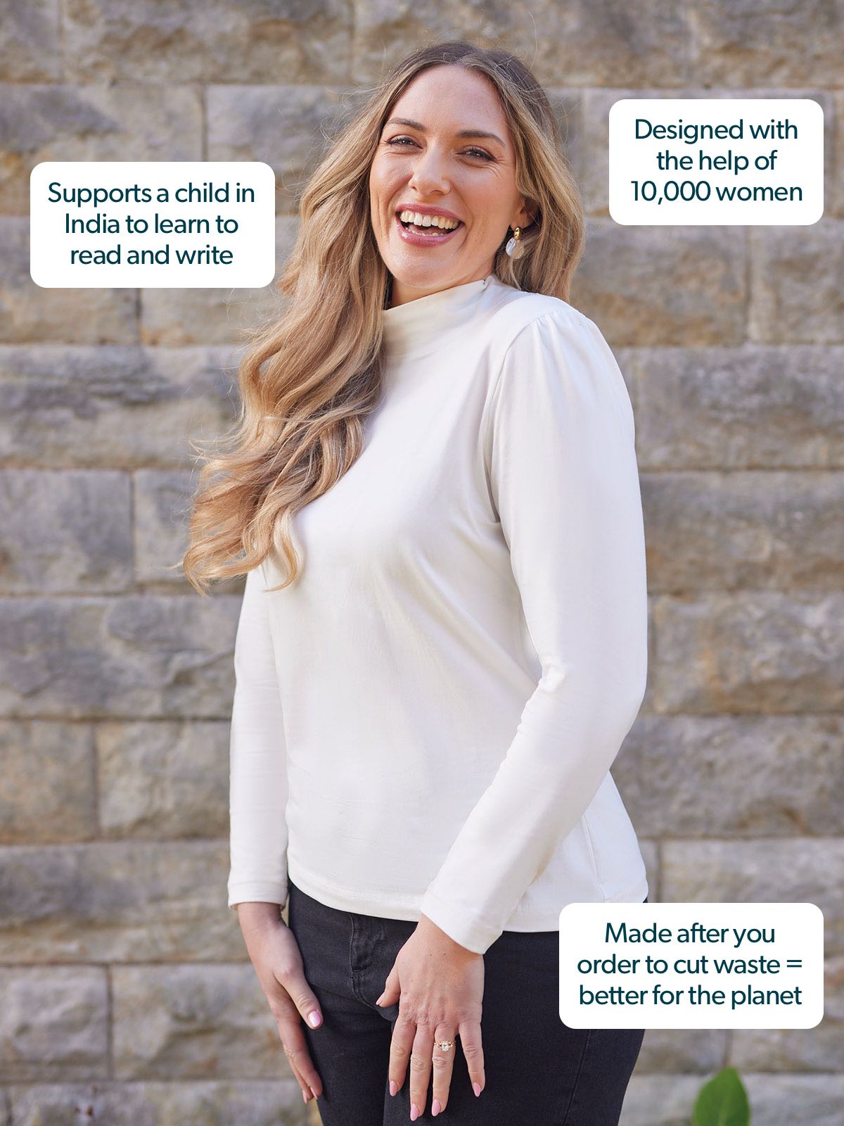 A highly versatile basic, the Polly with its gently puffed sleeves works on its own worn with any of our trousers or skirts but also adds an extra soft cosy layer under the Sandie pinafore dress.