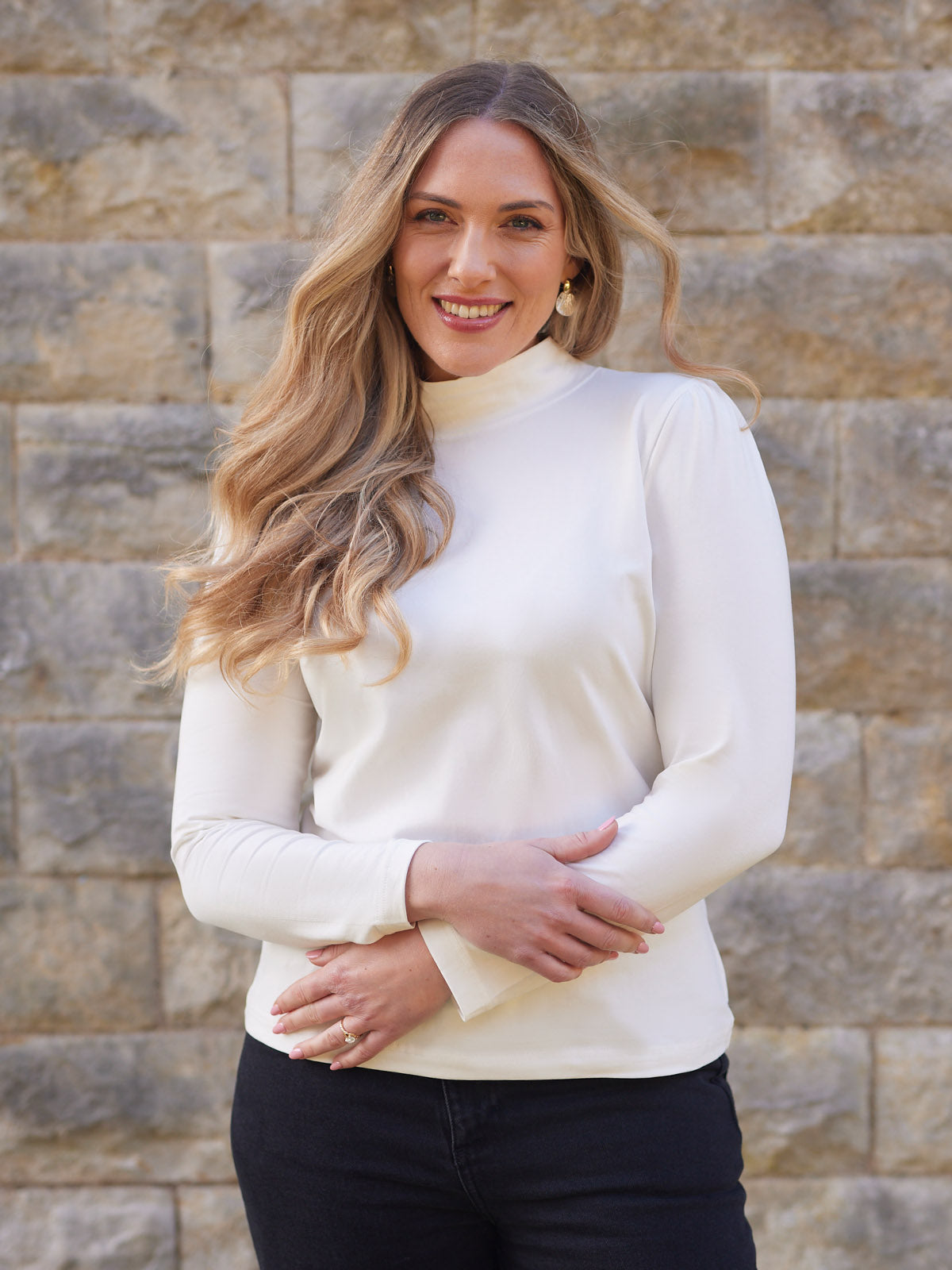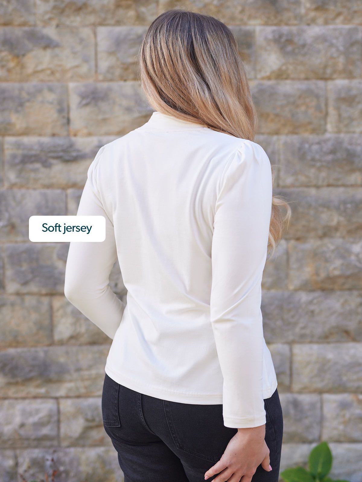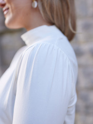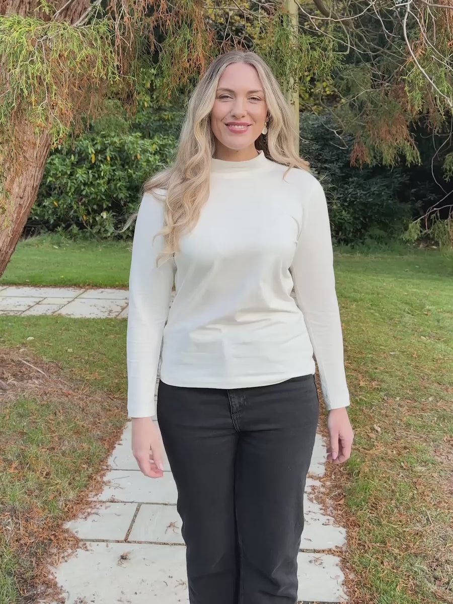 The super versatile Polly is a lovely high neck jersey top - some might call it semi polo-necked. Made of a supersoft 95% cotton with 5% elastane, this is a thick material, totally not see through and with lots of flattering stretch. The Polly has long cuffed sleeves and comes in a lovely rich black colour as well as in a warm ecru version. This is a sustainable jersey top that is just perfect for adding warmth on colder days.