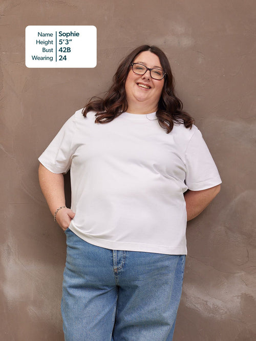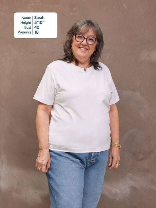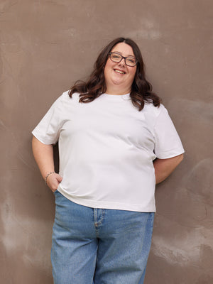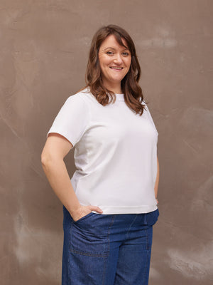 Sustainable basics? Yes please! Our new Adele relaxed t-shirt is the perfect wardrobe addition and looks great. Made using a thick sustainable cotton fabric, with 5% elastane mixed in, the Adele has a little stretch to give a really high-quality fabric feel.