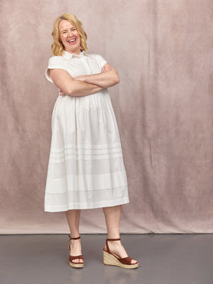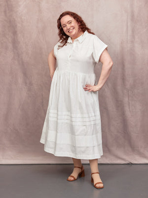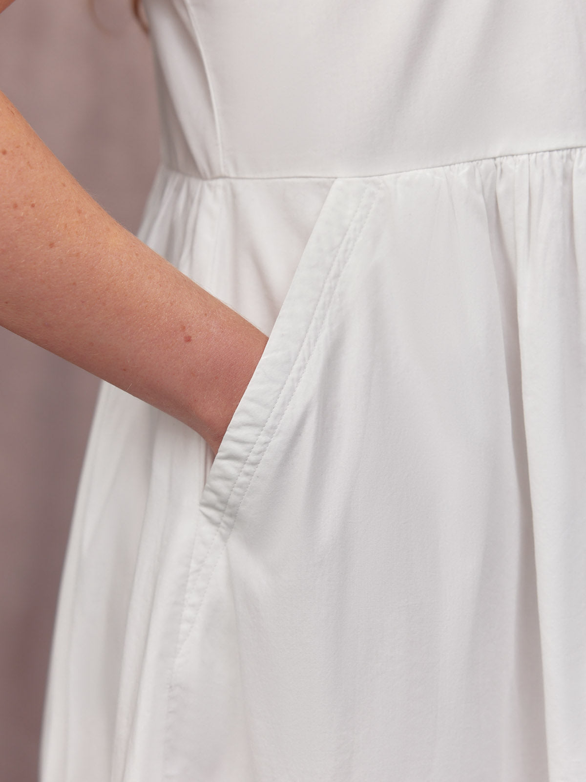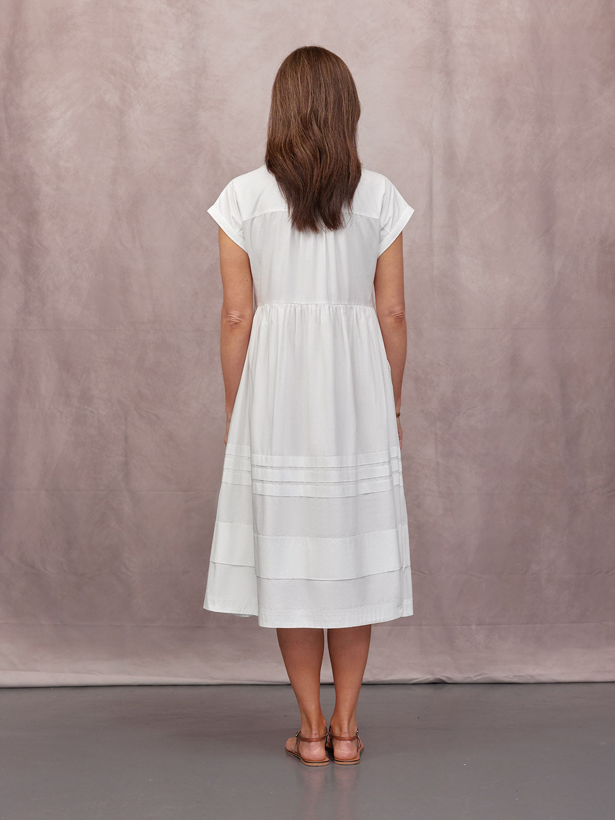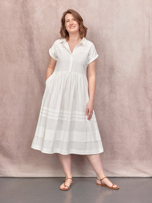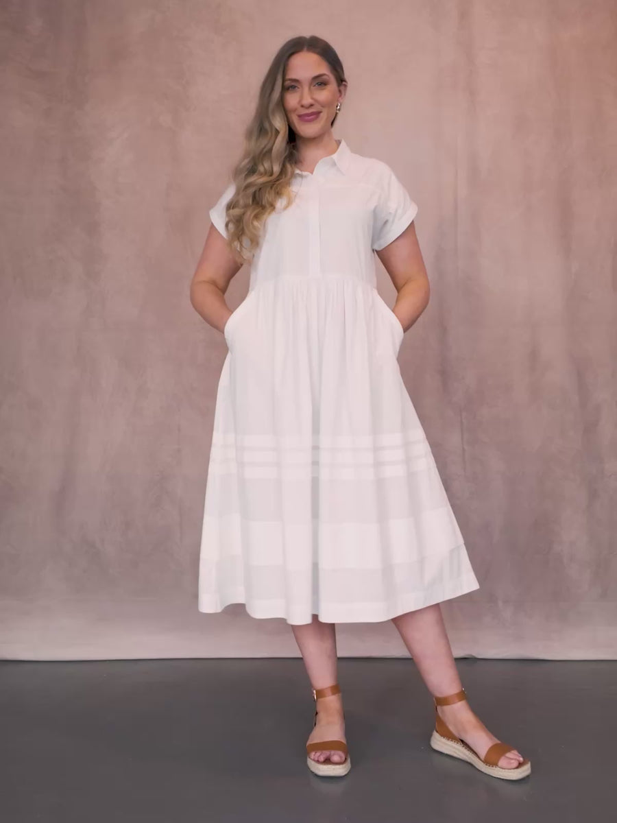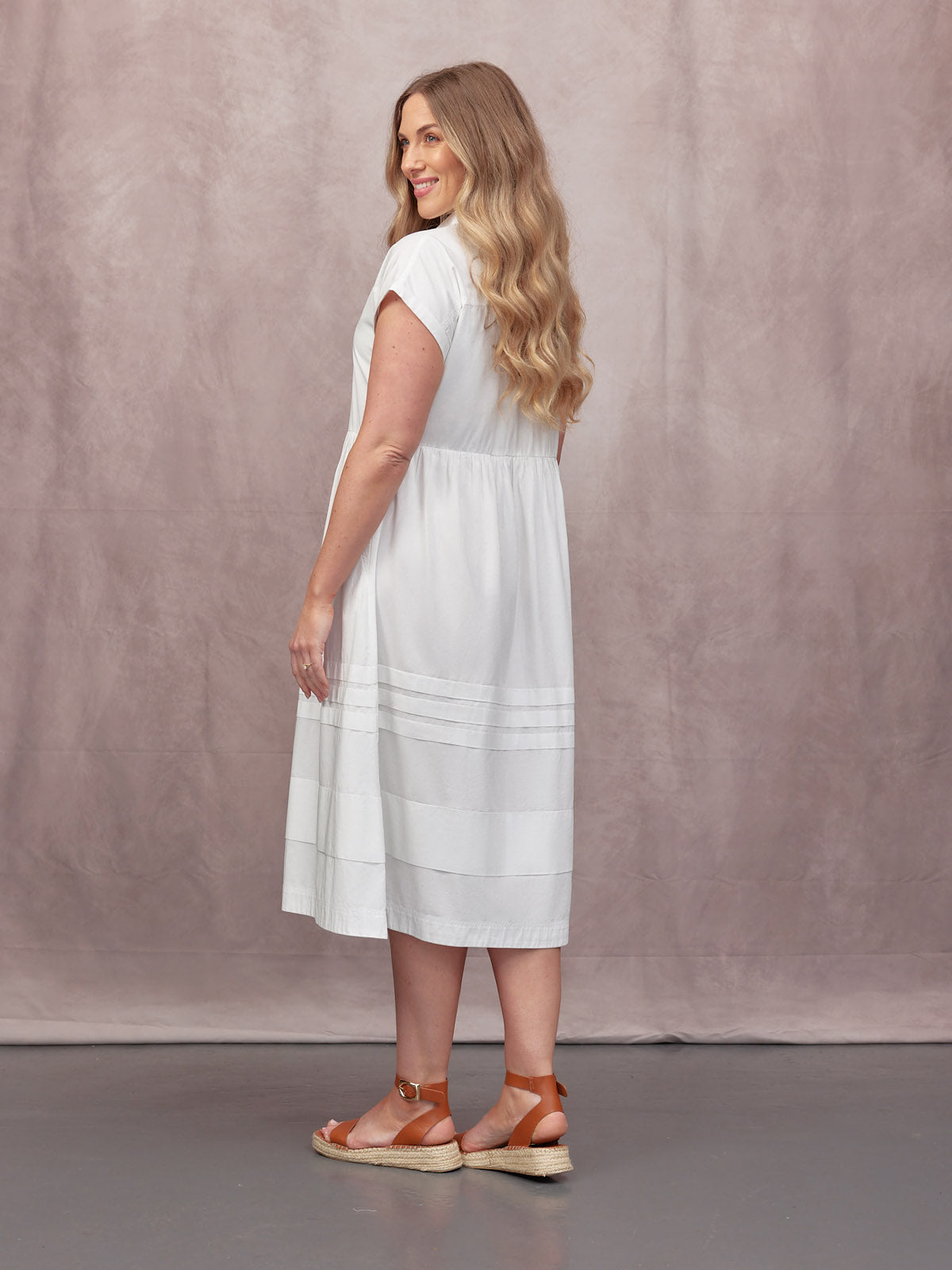Made in a sustainable, soft yet substantial cotton fabric, our new white Rhiona dress has buttons to the waist, short, capped sleeves and a flowing midi-length skirt featuring decorative tuck detailing. Simple, yet stylish - this dress has a relaxed flattering fit and those all important pockets. In a non-see-through white cotton fabric, this shirt dress has a crisp look for those lovely summer days.