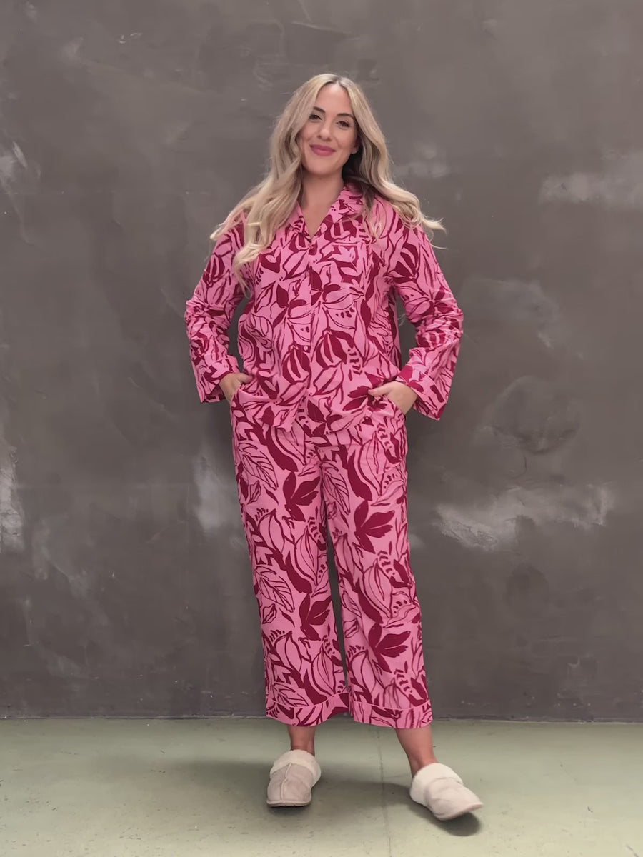 Made in cotton poplin fabric these button down pyjamas are super comfortable and super stylish - way too pretty just to wear to bed! Once you see past the fabulous eye catching prints, you’ll also notice all those little details that make these sustainable PJ sets extra luxurious: The piping on the cuffs and trouser edges, the deep pockets in the pyjama bottoms and the pocket detail on the shirt all add up to make these super comfortable pyjamas a cut above the rest.