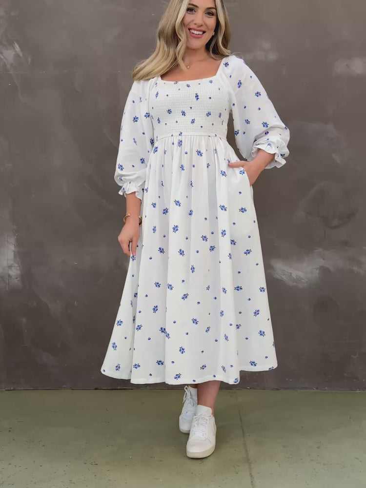 Back by popular demand is our super popular Sam shirred midi dress but this time she is coming in a beautiful, delicate white and blue floral print - which was loved by over 8,000 women during our design process.