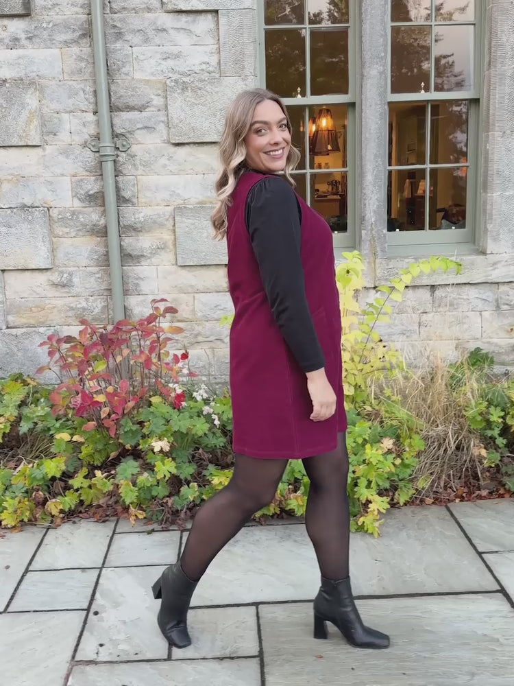 Our sustainable Sandie Pinafore Dress is back - by popular demand! This cord pinafore dress is now available in two rich winter colours; Green and Burgundy! Sandie is the perfect dress for the colder weather - coming in a lovely thick cosy corduroy that looks stunning in both colourways.