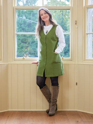 This sustainable pinafore dress is a perfect cross-seasonal item - perfect with or without tights, layered with a high neck top like the Polly or dressed-up with a statement blouse.