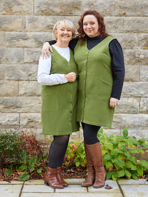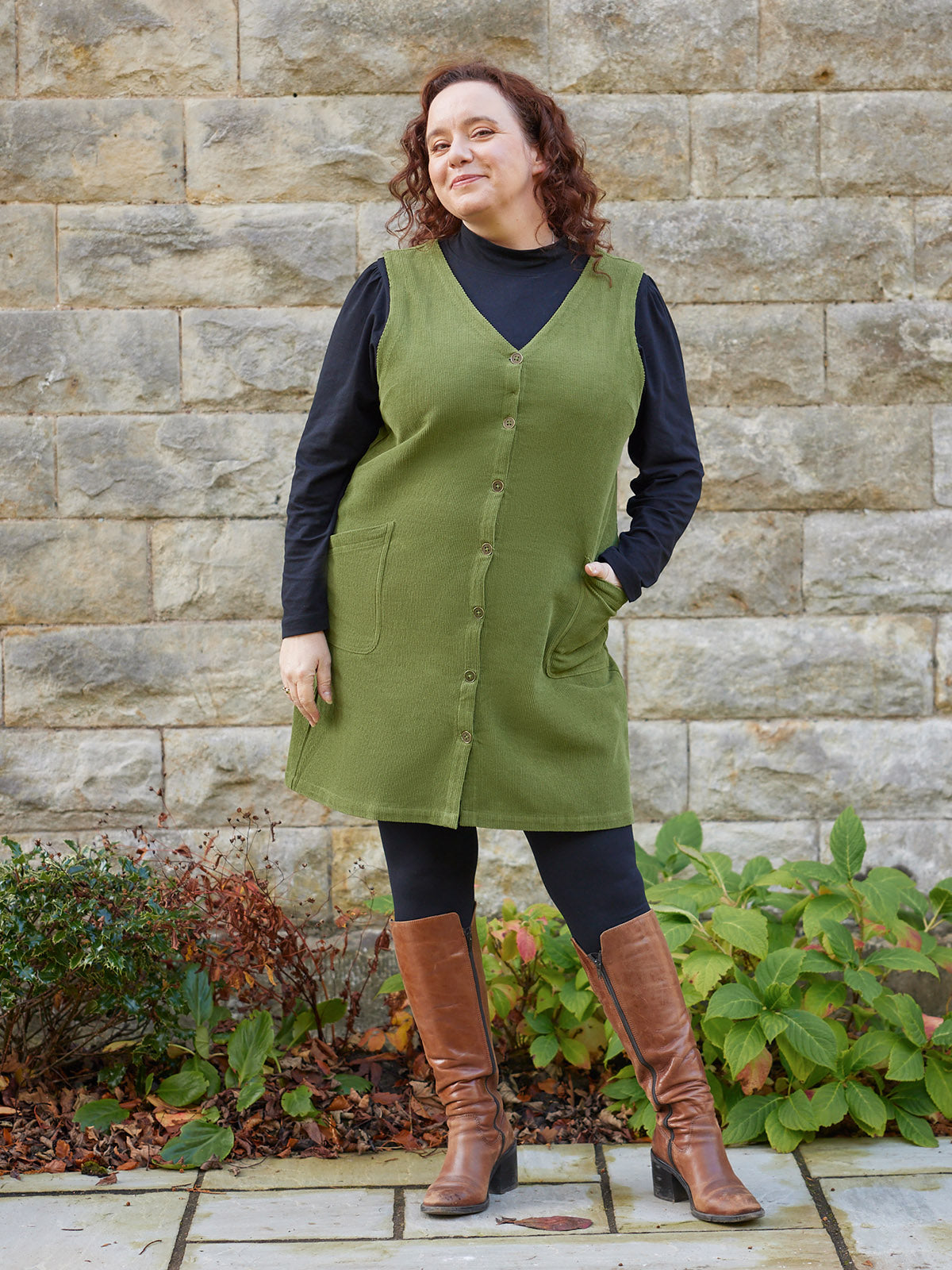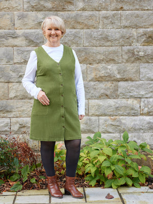 Our sustainable Sandie Pinafore Dress is back - by popular demand! This cord pinafore dress is now available in two rich winter colours; Green and Burgundy! Sandie is the perfect dress for the colder weather - coming in a lovely thick cosy corduroy that looks stunning in both colourways.